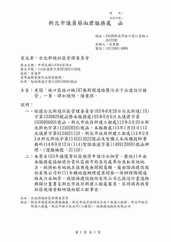 有關「林口區林口路187巷新闢道路暨污水下水道設計接管」一案,詳如說明,請查照。