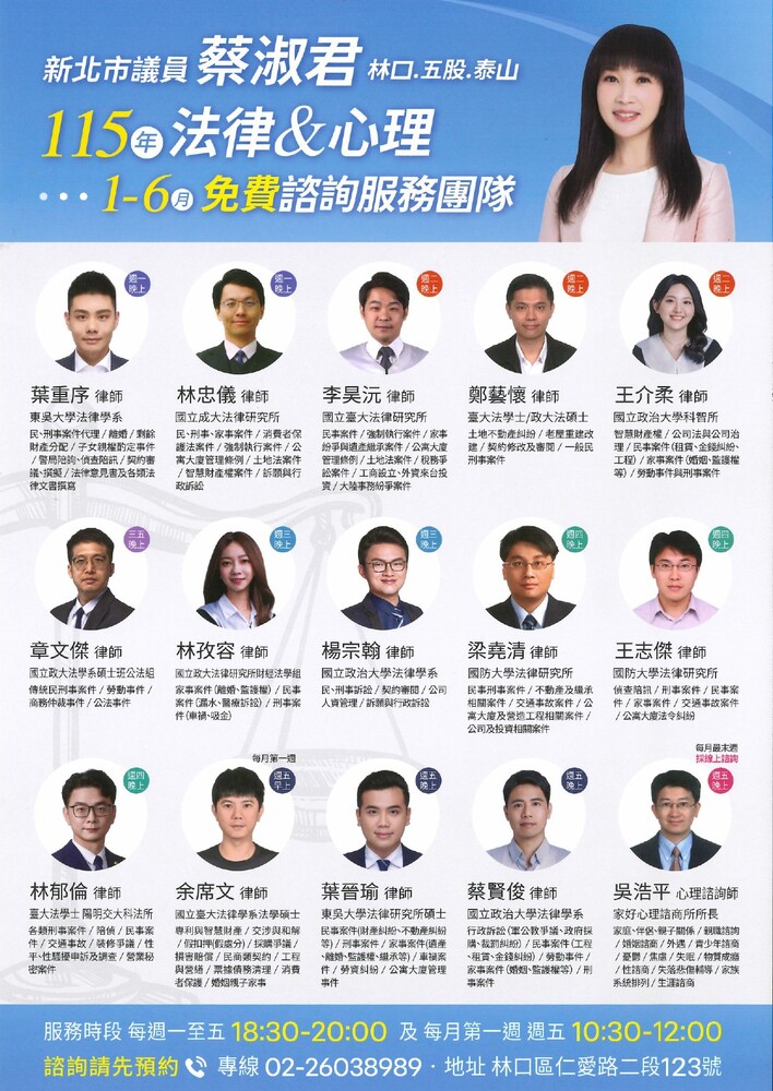 法律諮詢:每周一~五晚上、每月第一周五早上