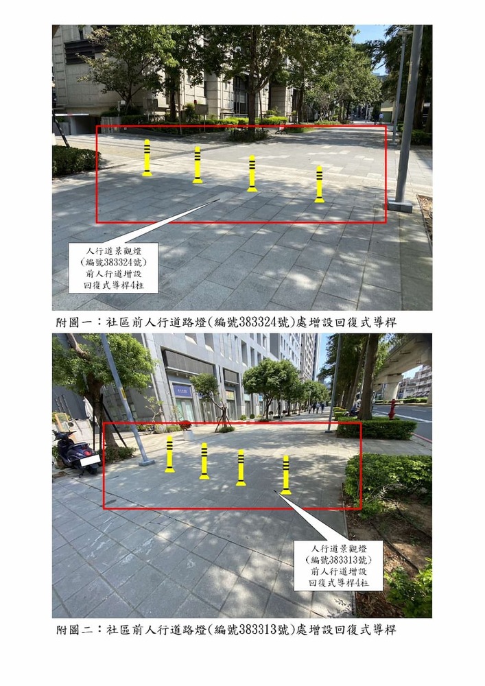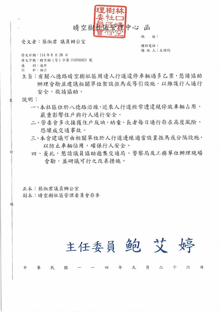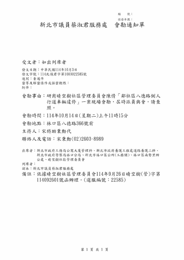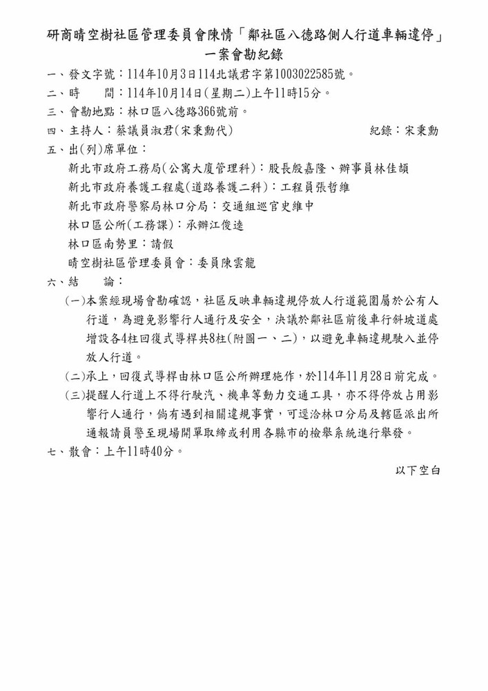研商晴空樹社區管理委員會陳情「鄰社區八德路側人行道車輛違停」一案現場會勘。(22585)