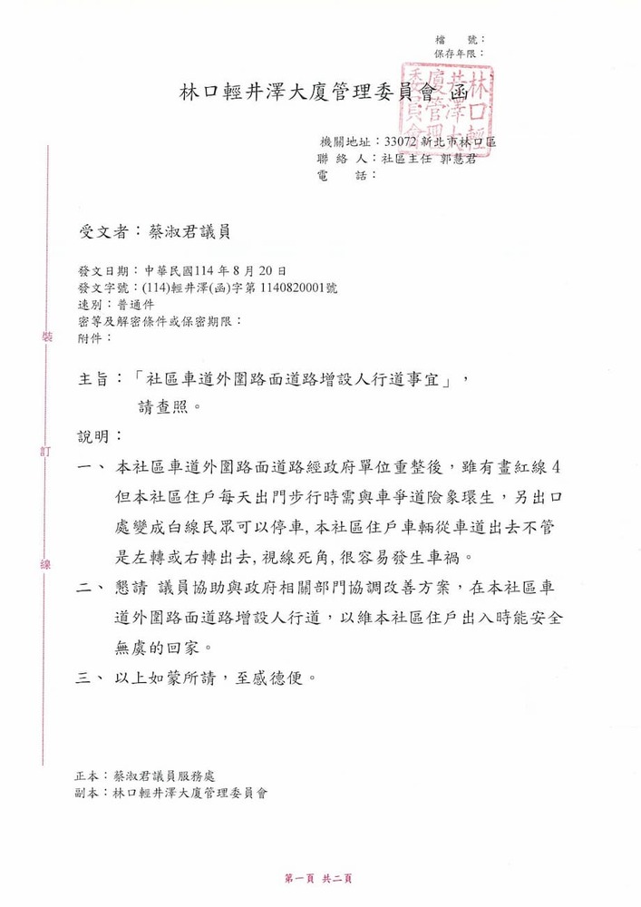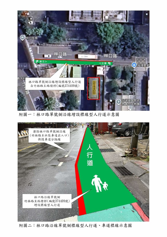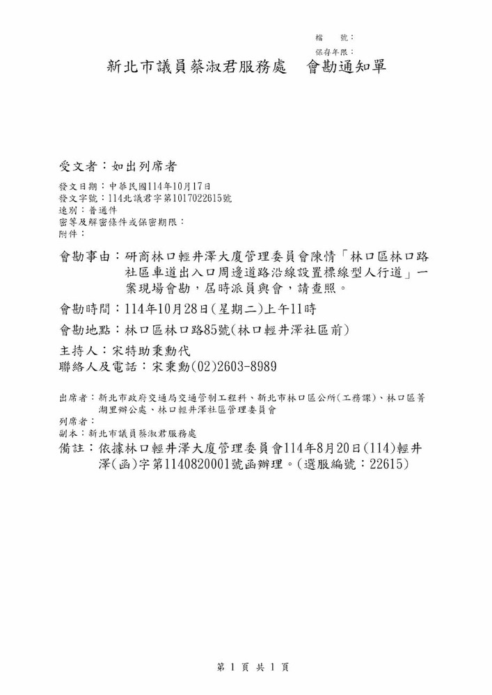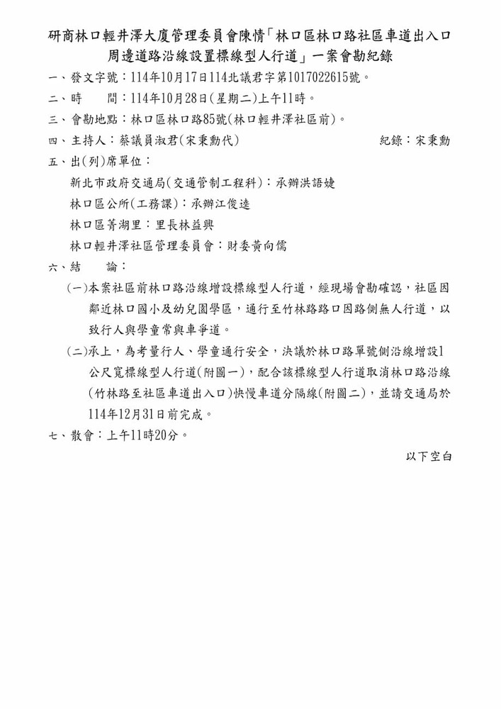 研商林口輕井澤大廈管理委員會陳情「林口區林口路社區車道出入口周邊道路沿線設置標線型人行道」一案現場會勘。(22615)