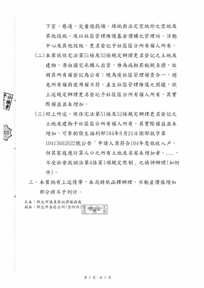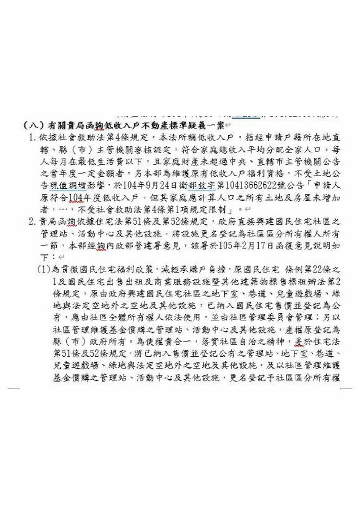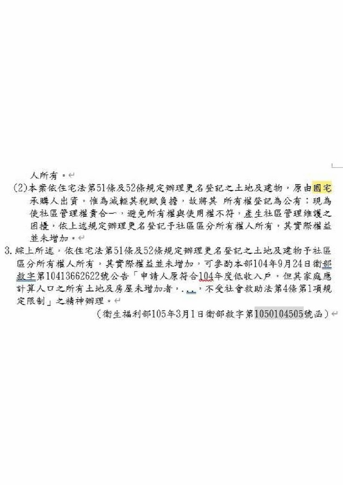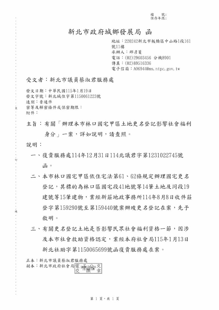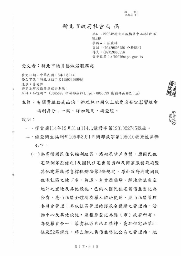 有關「辦理林口國宅土地更名登記影響社會福利身分」一案,詳如說明,請查照惠復。(22745)結案