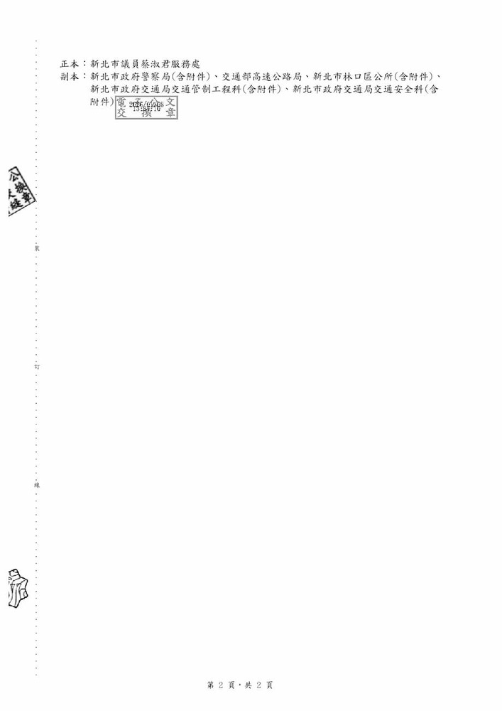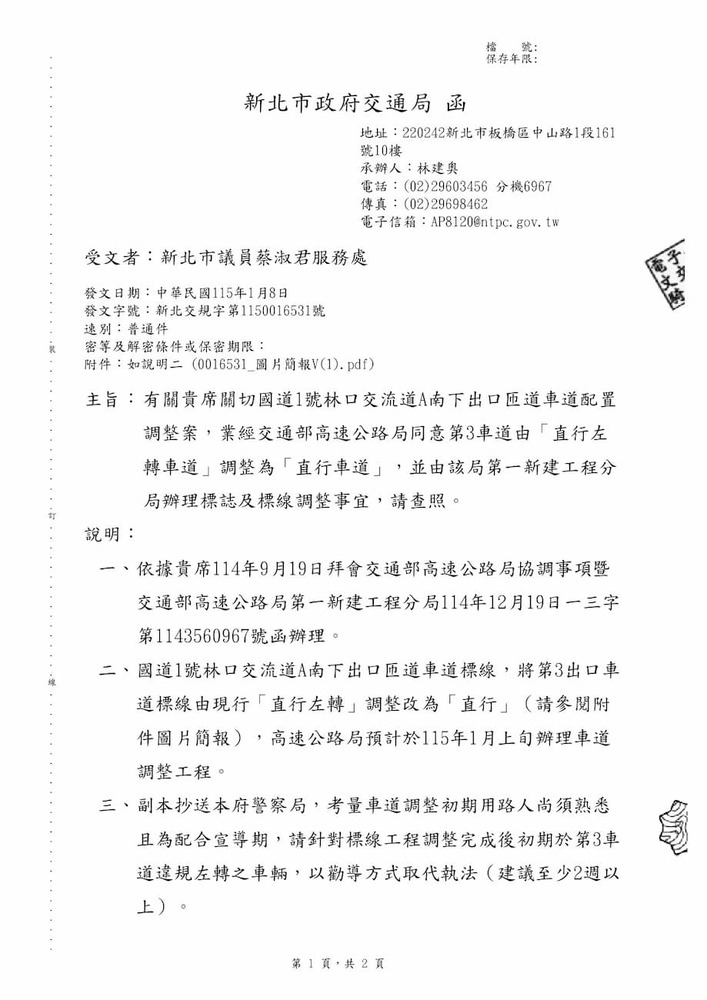 有關貴席關切國道1號林口交流道A南下出口匝道車道配置調整案