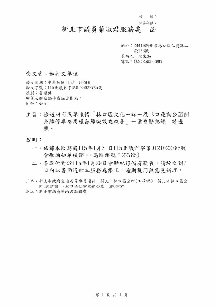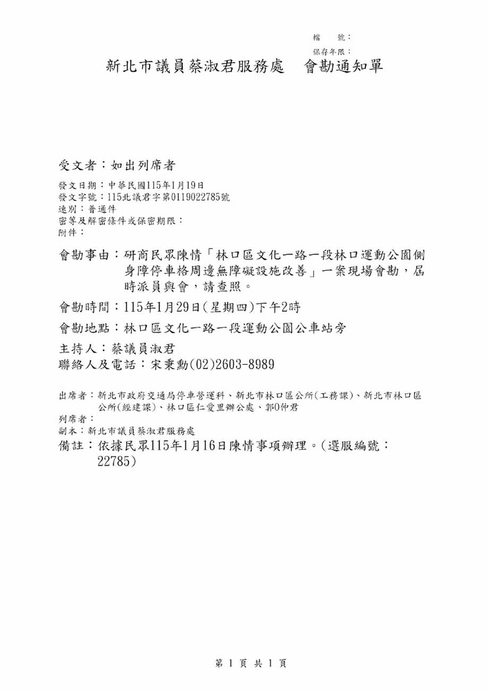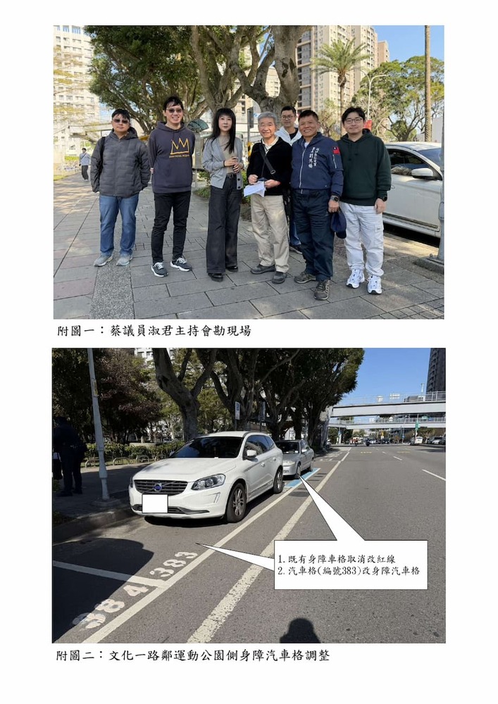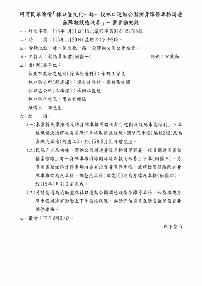 研商民眾陳情「林口區文化一路一段林口運動公園側身障停車格周邊無障礙設施改善」一案現場會勘。(22785)