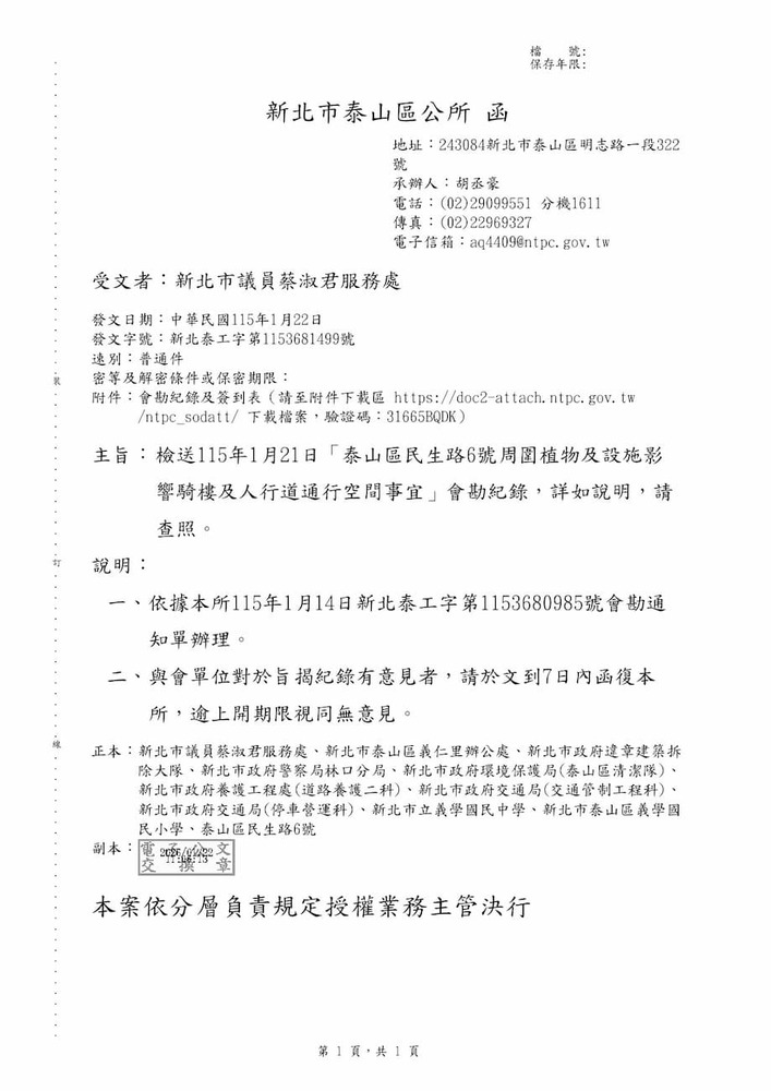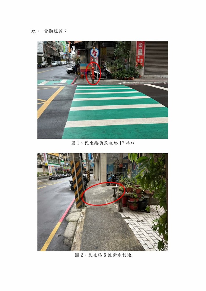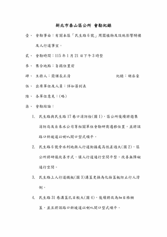 「泰山區民生路6號周圍植物及設施影響騎樓及人行道通行空間事宜」會勘紀錄。(22805)