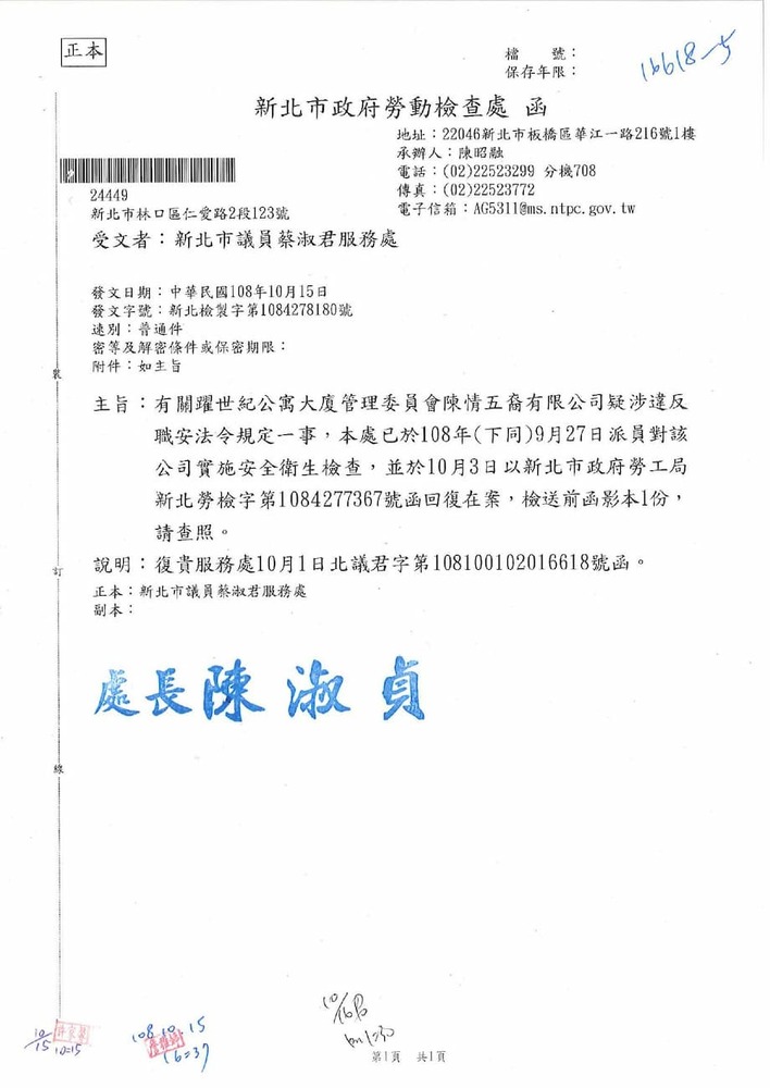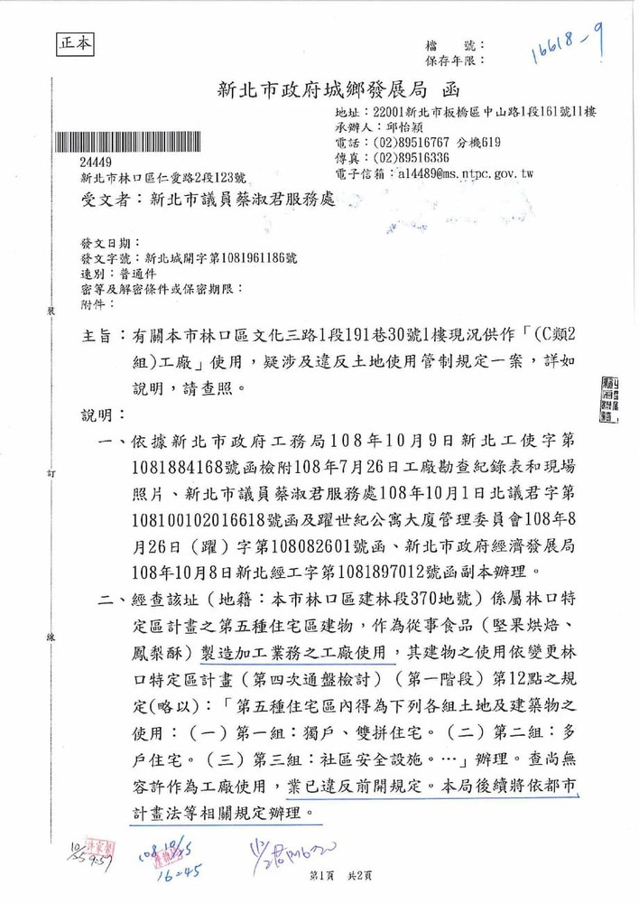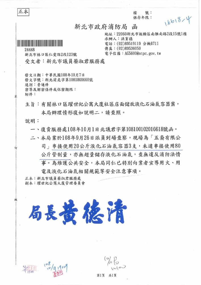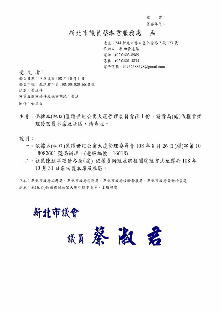 函轉本(林口)區躍世紀公寓大廈管理委員會函1份,請貴局(處)依權責辦理後回覆本席及社區,請查照。(16618)結案
