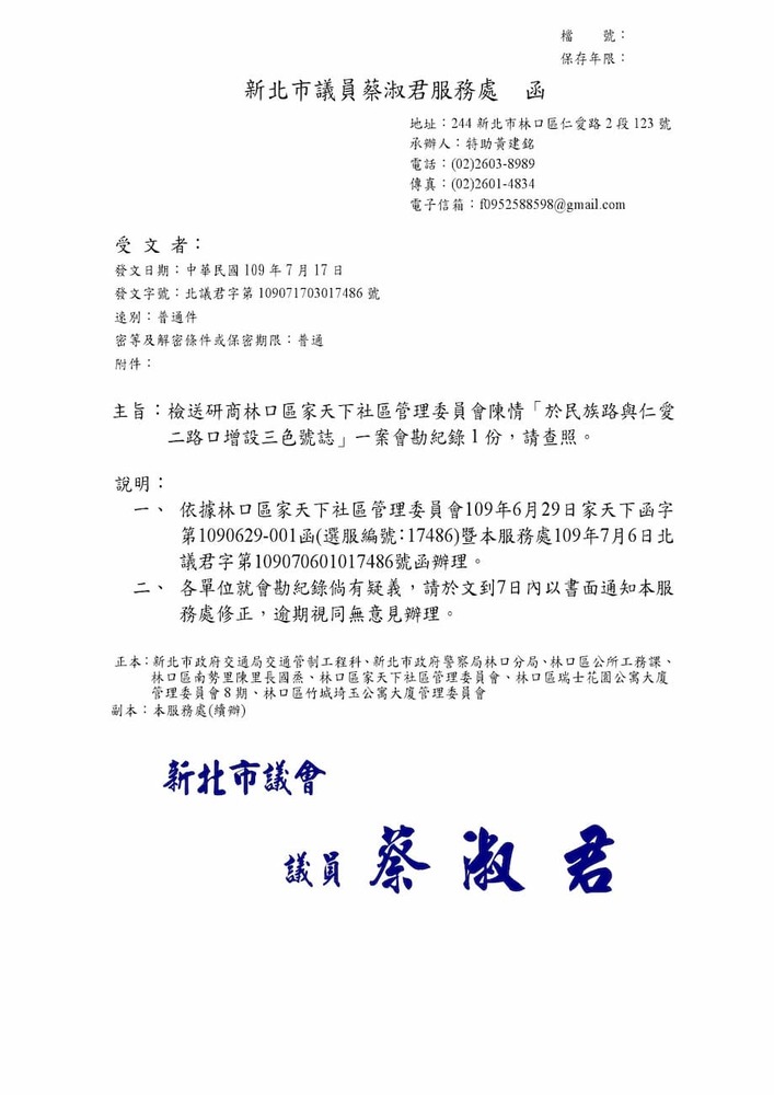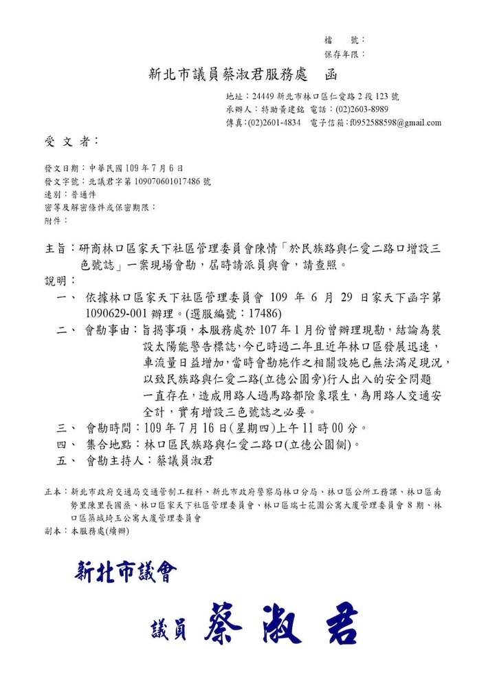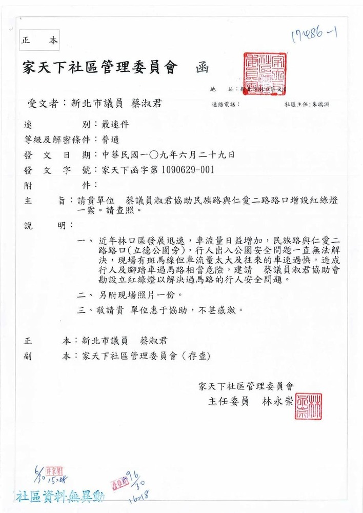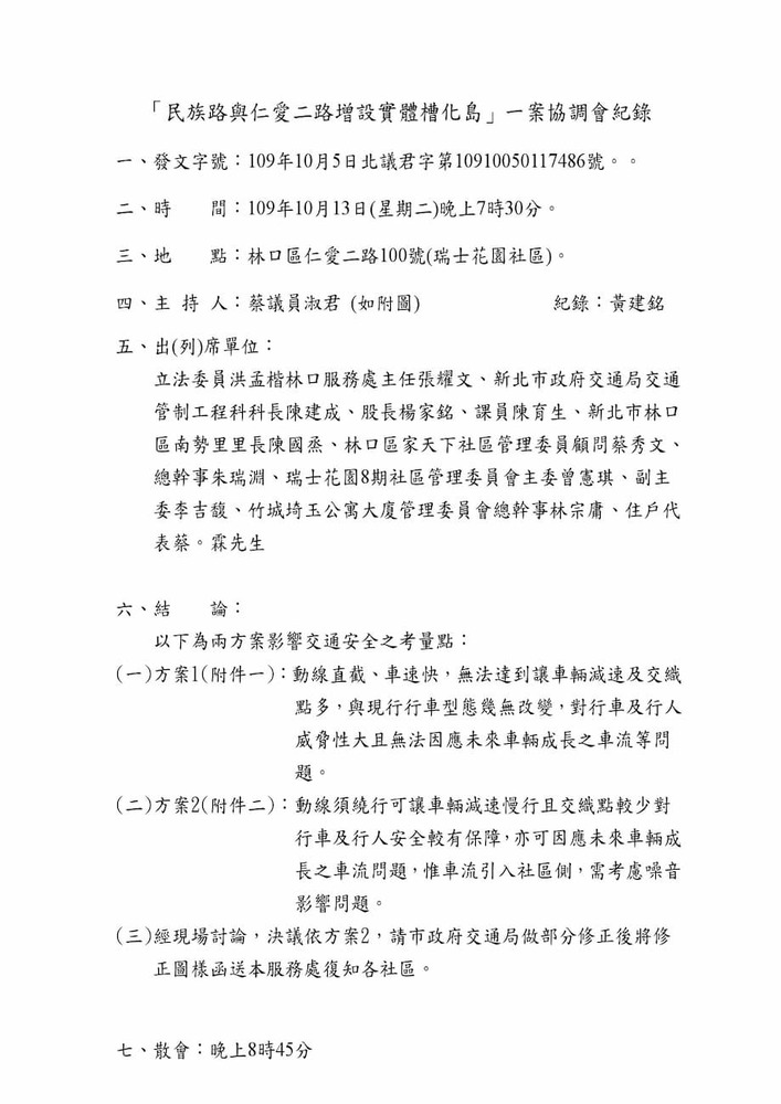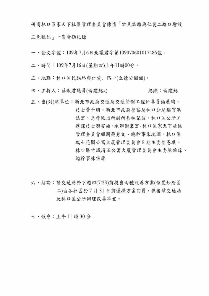 研商林口區家天下社區管理委員會陳情「於民族路與仁愛二路口增設紅綠燈號誌」一案會勘。(17486)結案