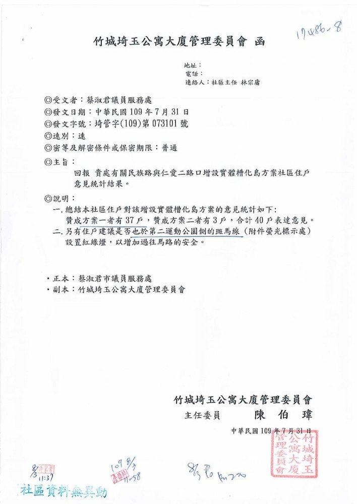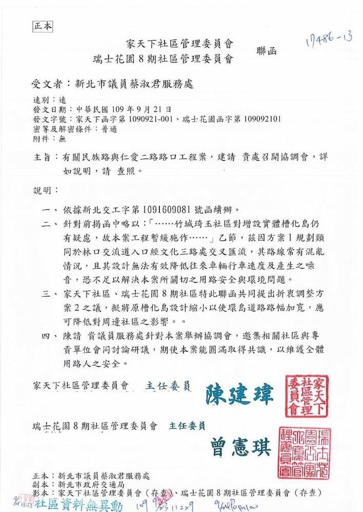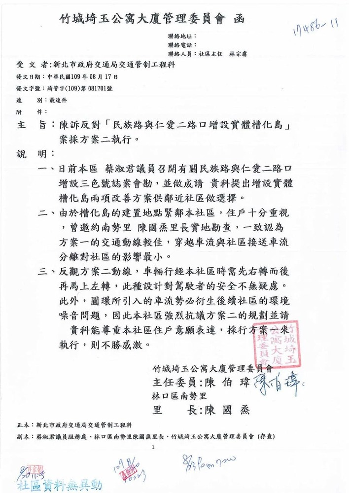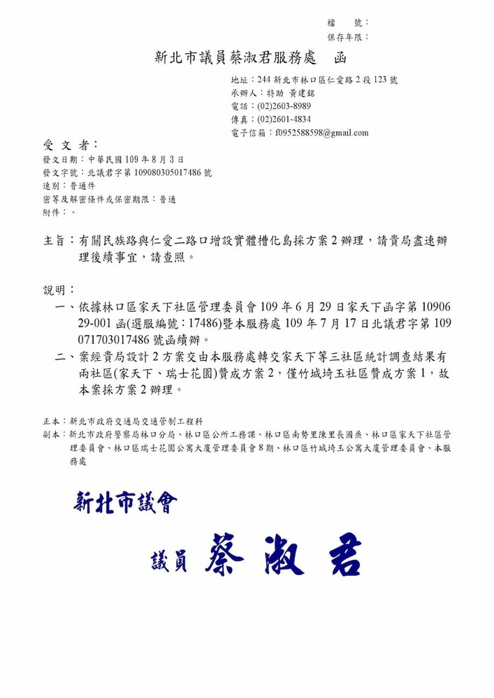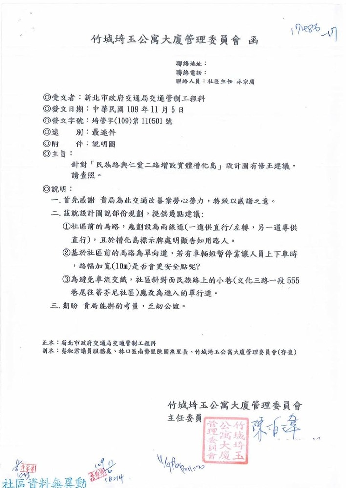 研商林口區家天下社區管理委員會陳情「於民族路與仁愛二路口增設紅綠燈號誌」一案會勘。(17486)結案