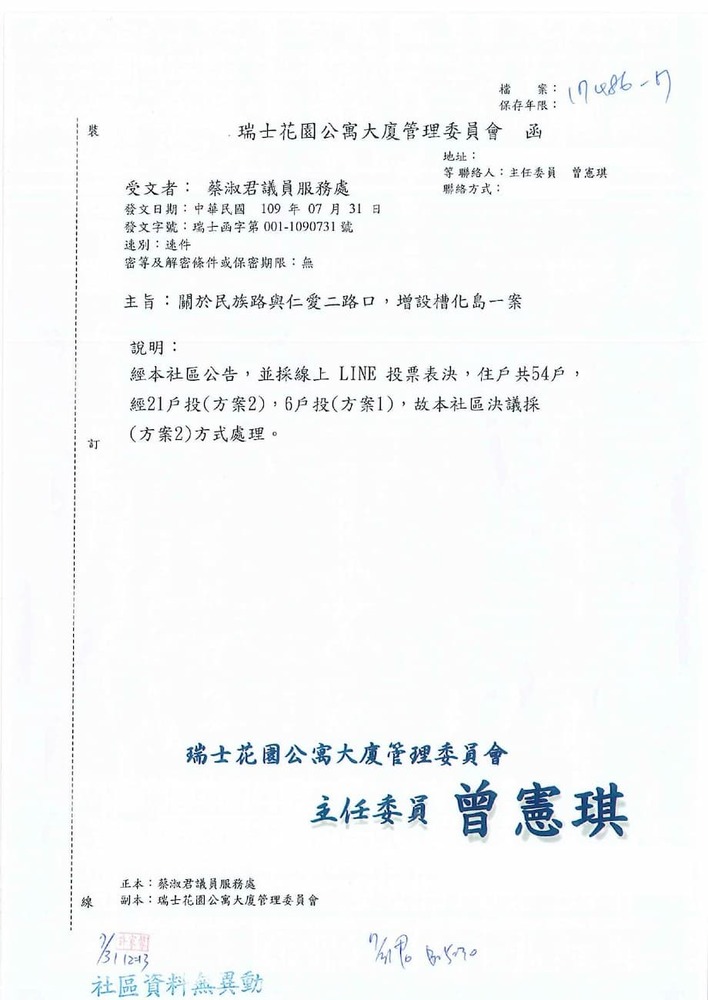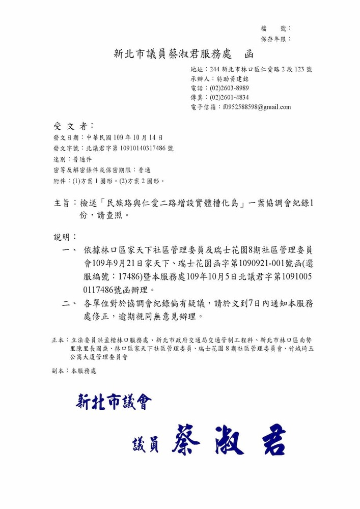 召開「民族路與仁愛二路增設實體槽化島」一案協調會,屆時請派員與會,請查照。