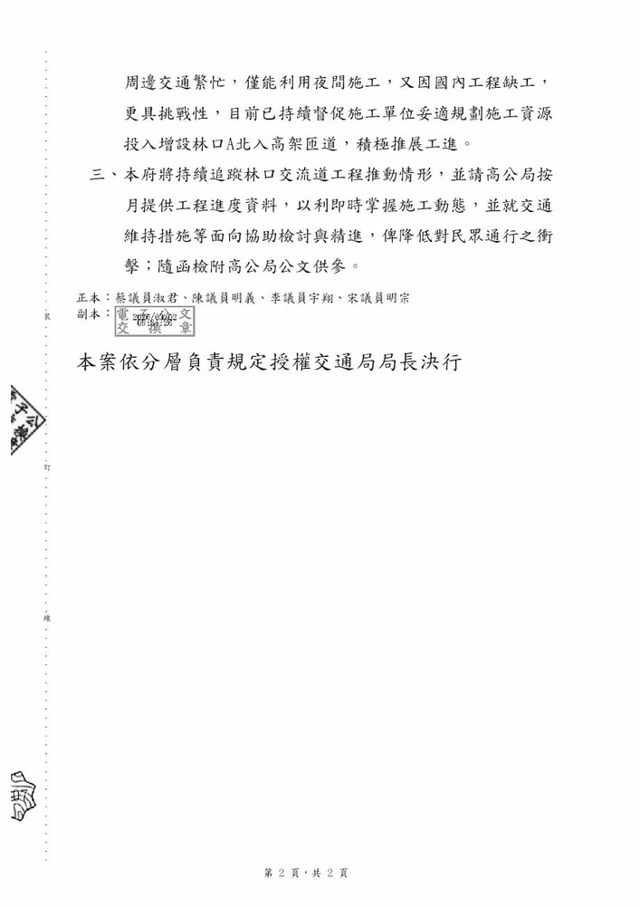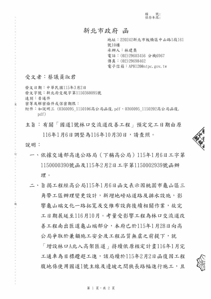 有關「國道1號林口交流道改善工程」預定完工日期由原116年1月6日調整為116年10月30日。