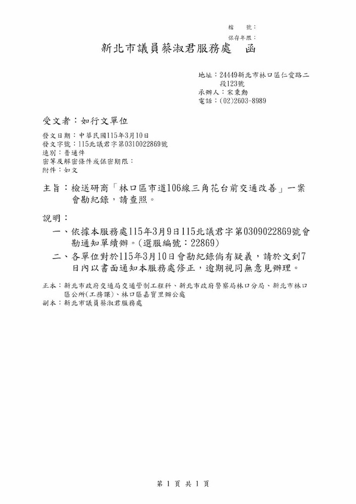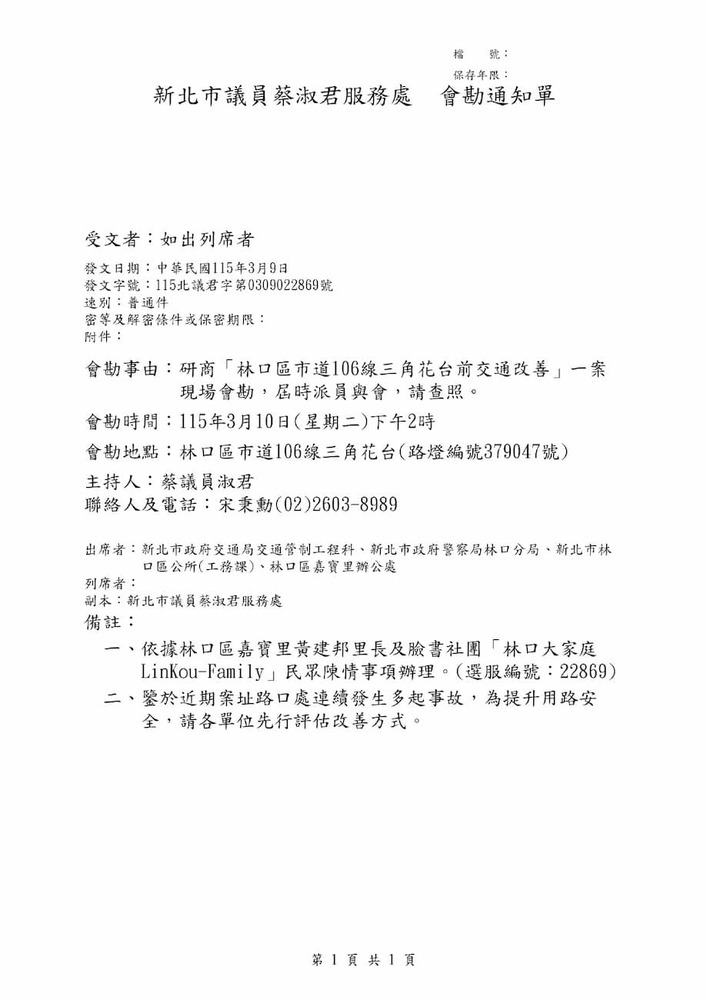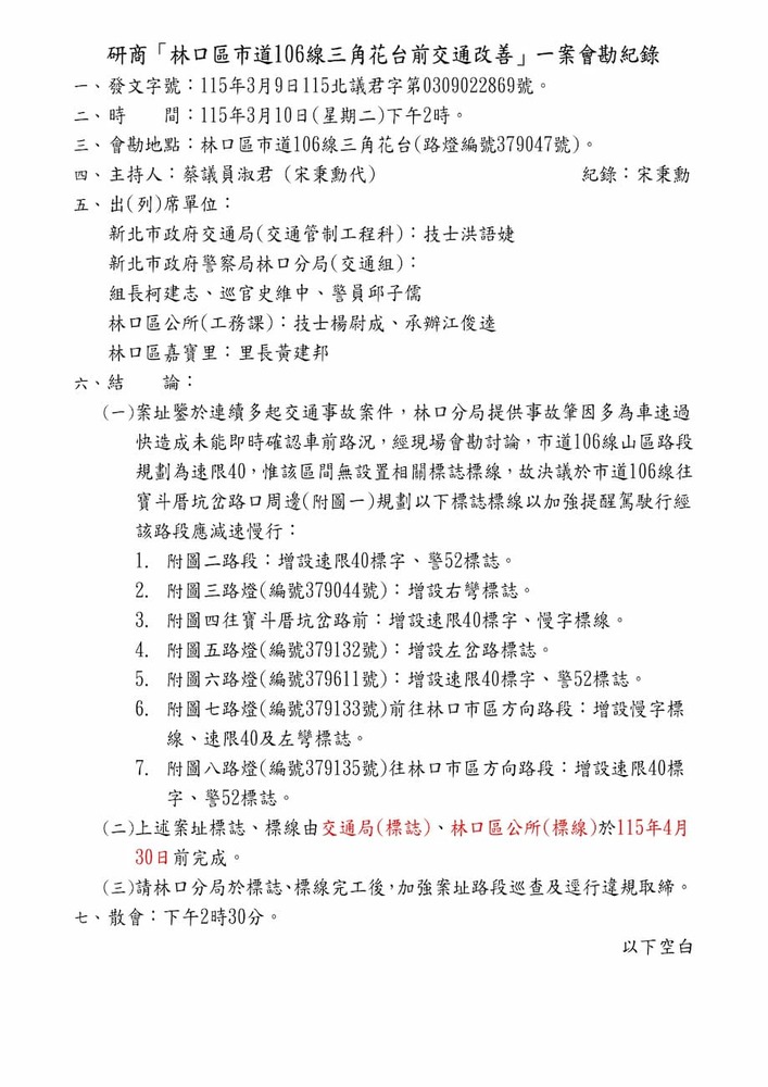 研商「林口區市道106線三角花台前交通改善」一案現場會勘。(22869)