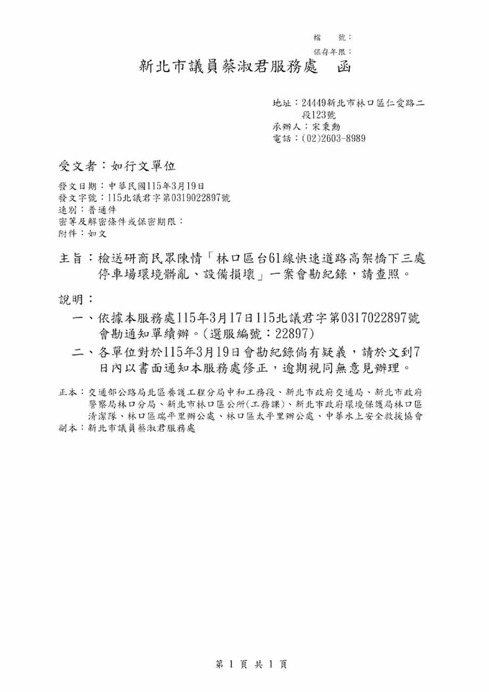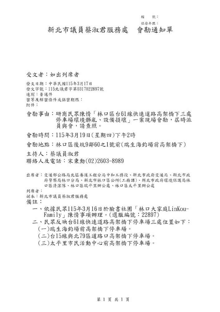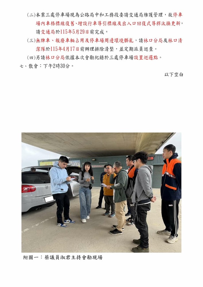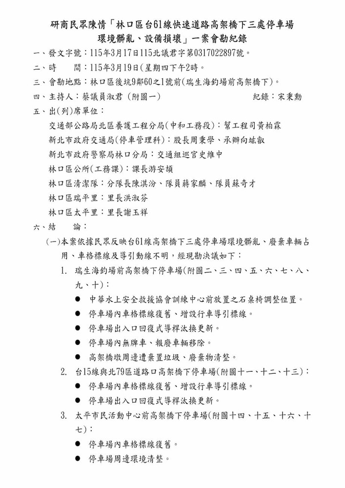 研商民眾陳情「林口區台61線快速道路高架橋下三處停車場環境髒亂、設備損壞」一案現場會勘。(22897)