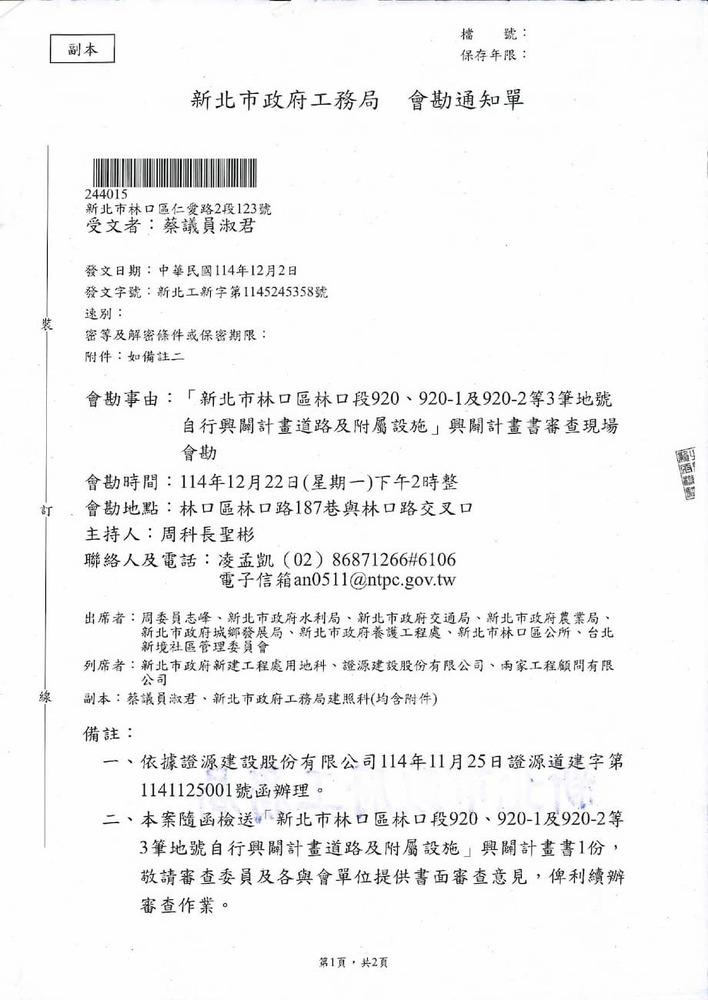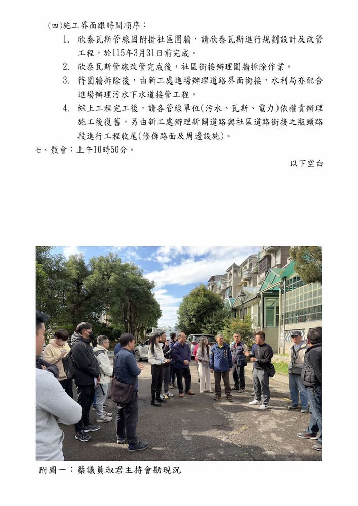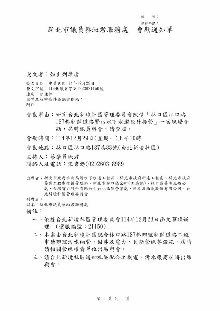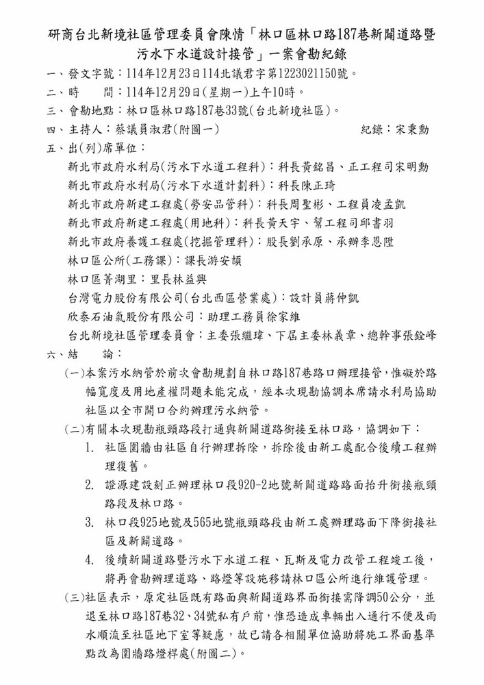 研商台北新境社區管理委員會陳情「林口區林口路187巷瓶頸路段打通及污水納管」一案會勘。(21150)
