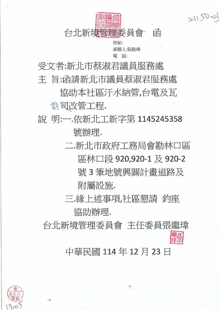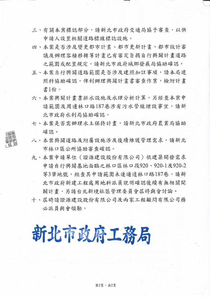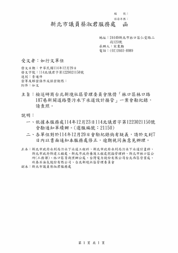 有關「林口區林口路187巷新闢道路暨污水下水道設計接管」一案,詳如說明,請查照。
