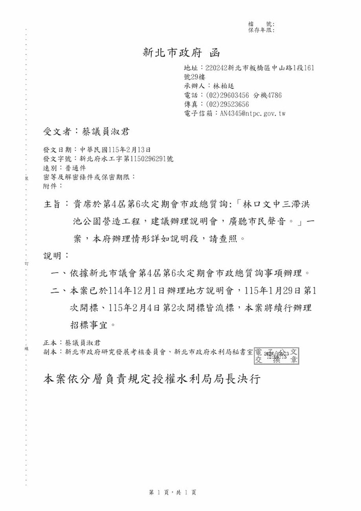 召開「林口區文中三滯洪池整體景觀優化工程委託設計監造技術服務」服務實施計畫書審查會議。(22387)