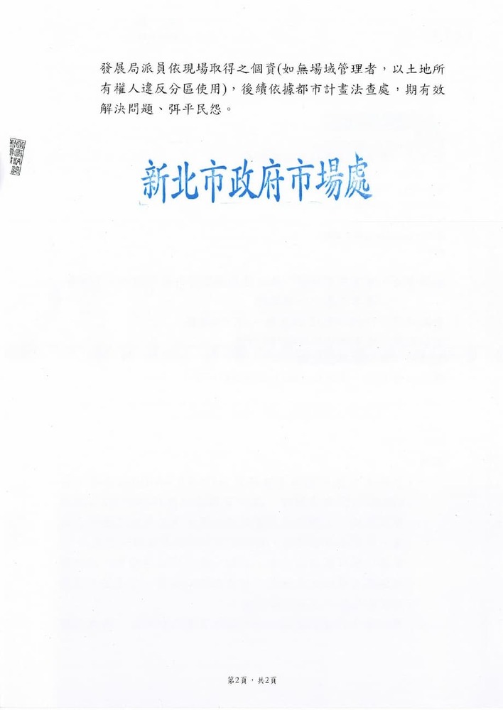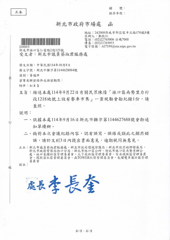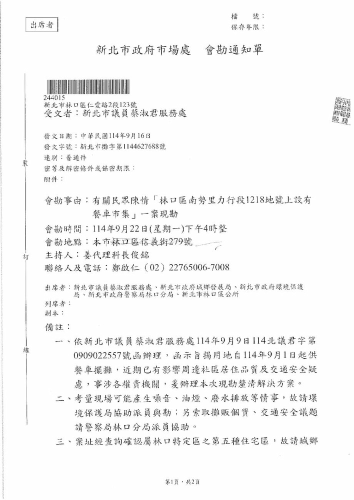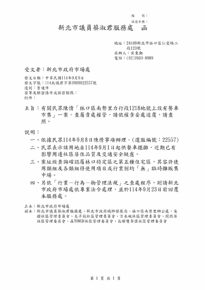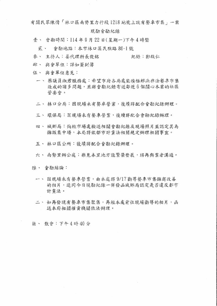 有關民眾陳情「林口區南勢里力行段1218地號上設有餐車市集」一案,查屬貴處權管,請依權責妥處逕覆,請查照。(22557)暫存