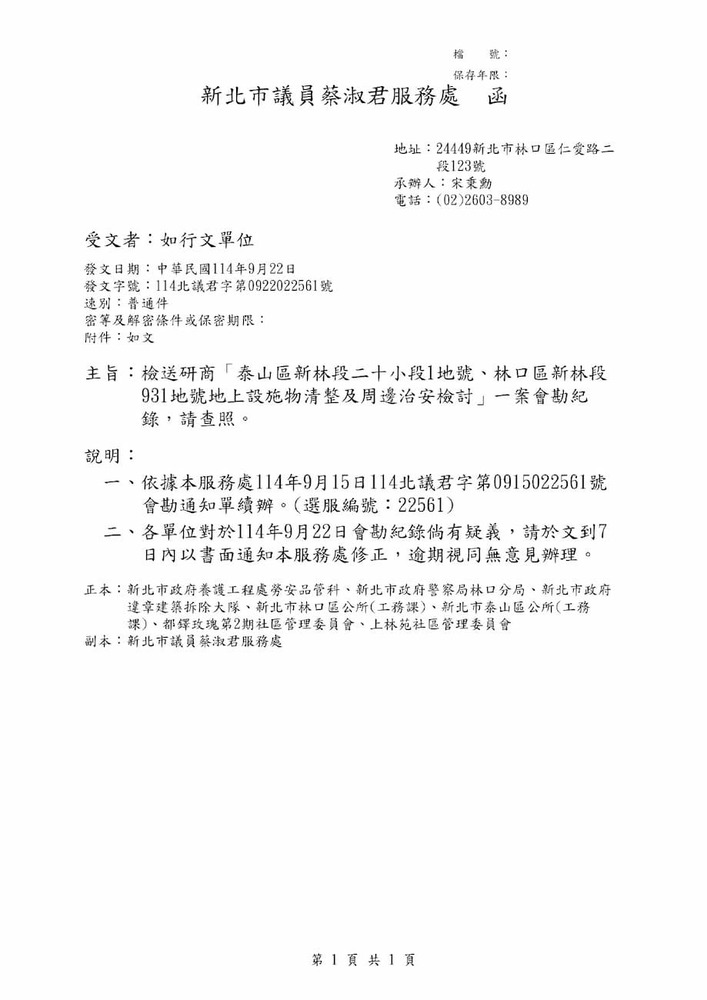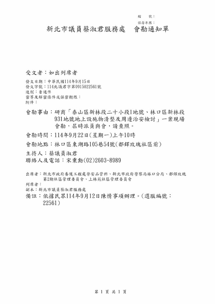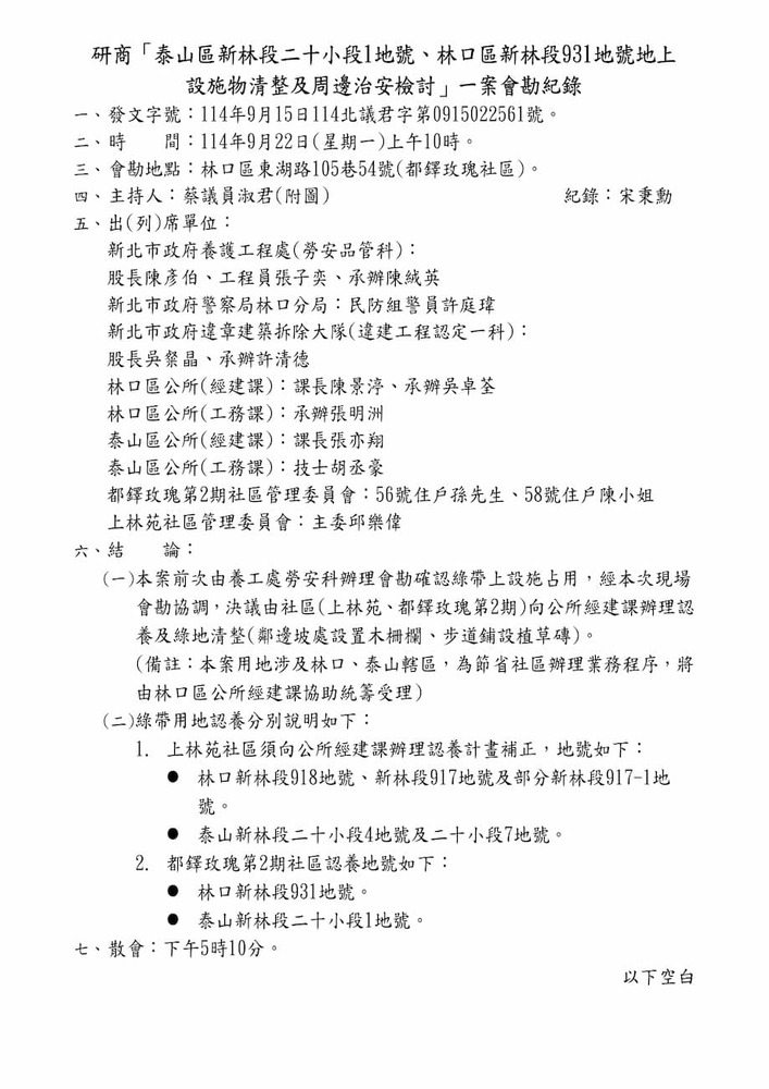 研商「泰山區新林段二十小段1地號、林口區新林段931地號地上設施物清整及周邊治安檢討」一案現場會勘。(22561)結案