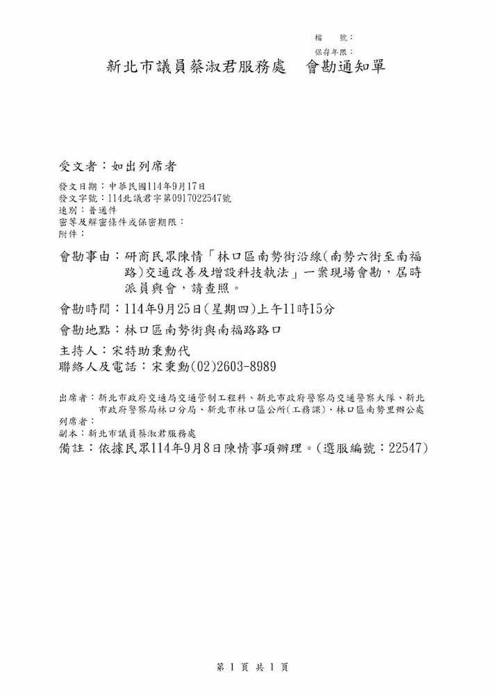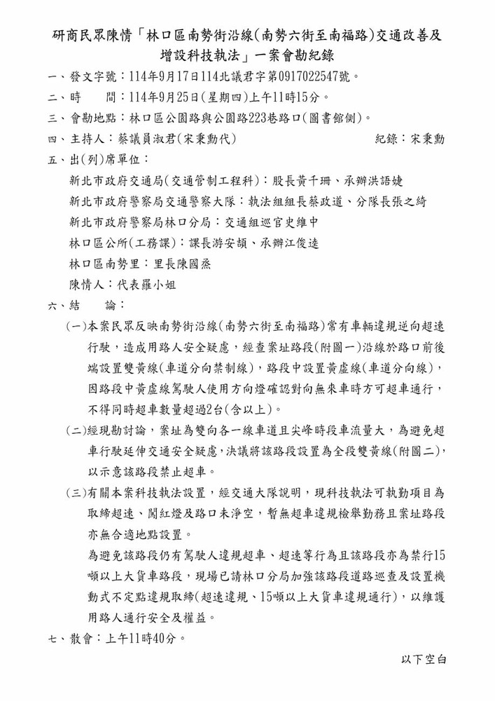研商民眾陳情「林口區南勢街沿線(南勢六街至南福路)交通改善及增設科技執法」一案現場會勘。(22547)結案
