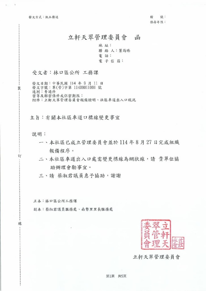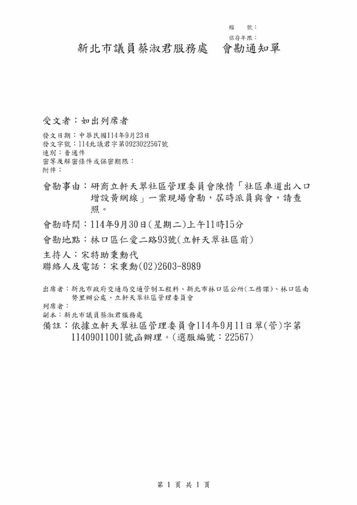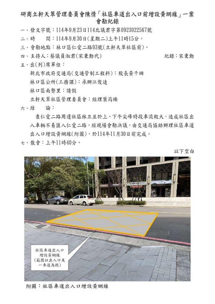研商立軒天翠社區管理委員會陳情「社區車道出入口增設黃網線」一案現場會勘。(22567)