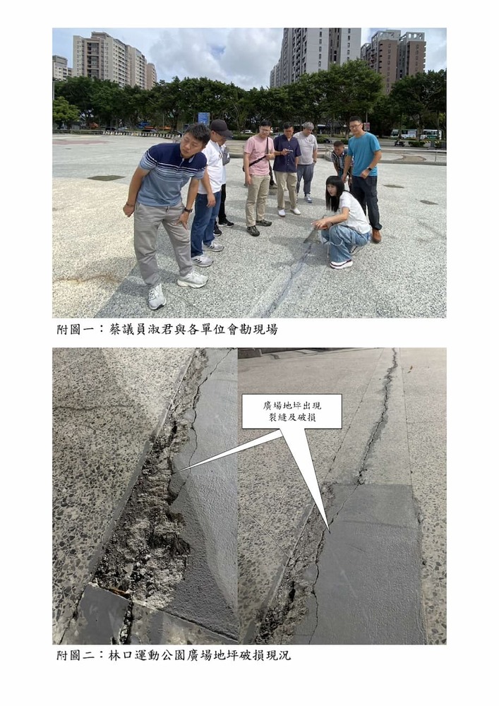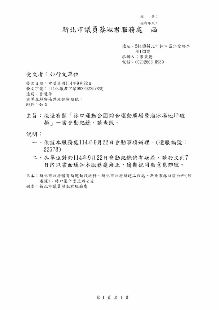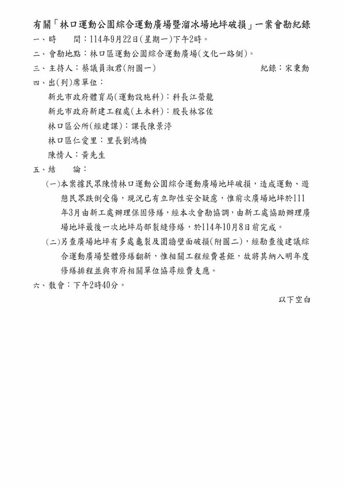 檢送有關「林口運動公園綜合運動廣場暨溜冰場地坪破損」一案會勘紀錄。(22578)