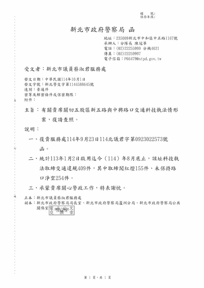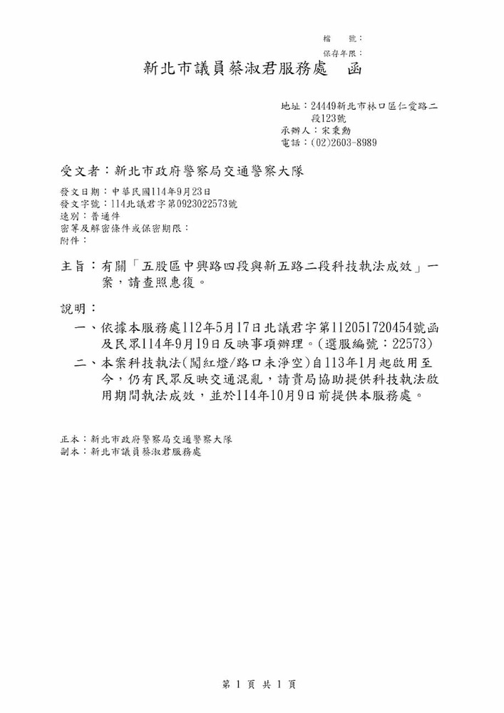 有關「五股區中興路四段與新五路二段科技執法成效」一案,請查照惠復。(22573)結案