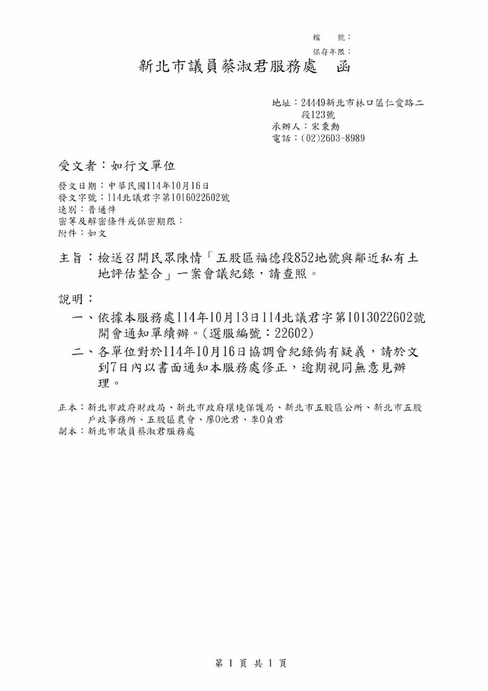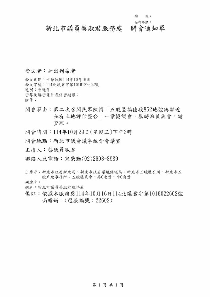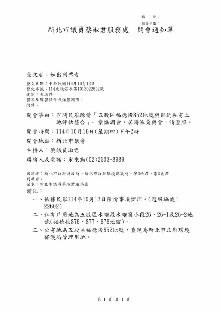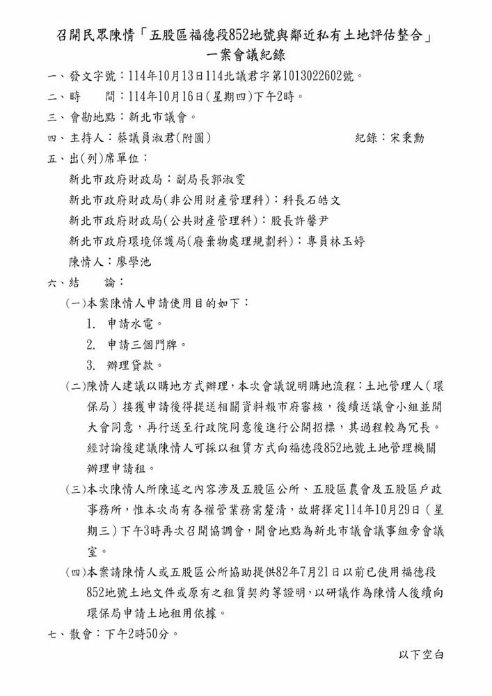 召開民眾陳情「五股區福德段852地號與鄰近私有土地評估整合」一案協調會。(22602)