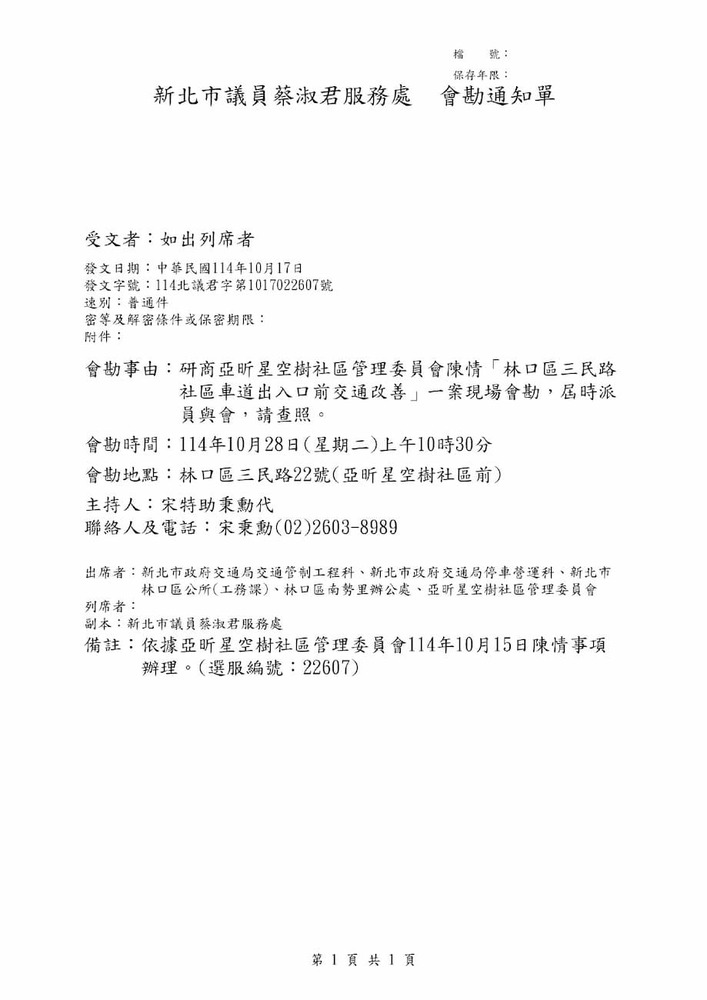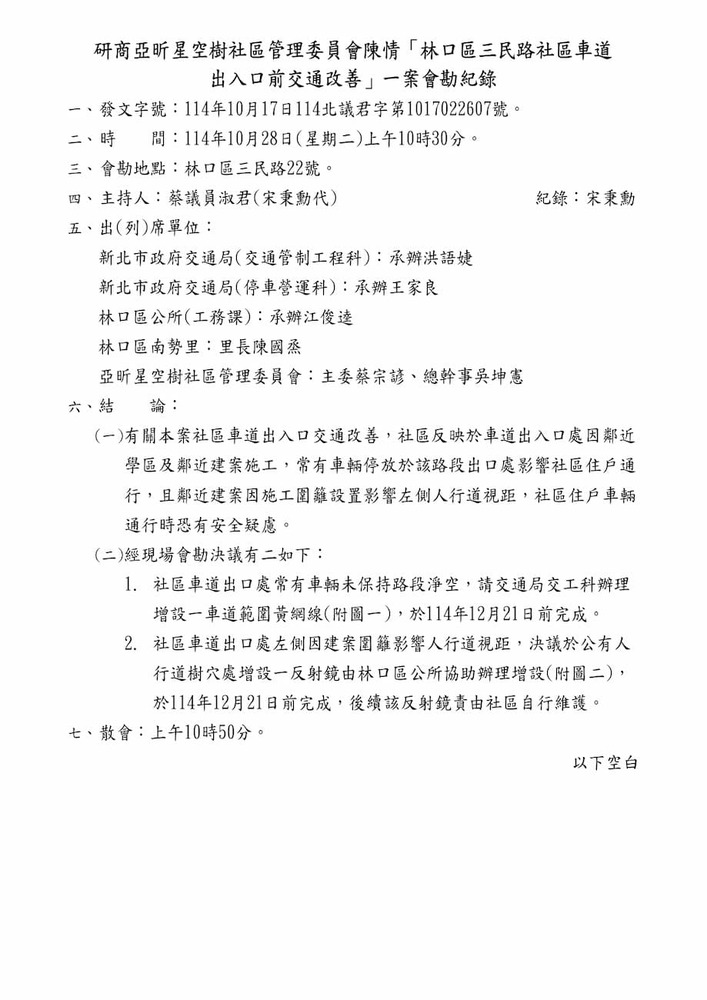 研商亞昕星空樹社區管理委員會陳情「林口區三民路社區車道出入口前交通改善」一案現場會勘。(22607)