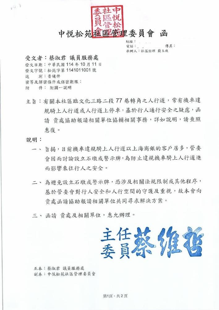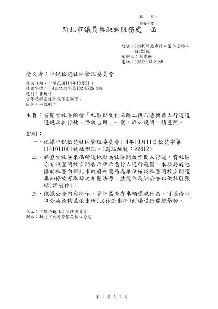 有關貴社區陳情「社區鄰文化三路二段77巷轉角人行道遭違規車輛行駛、停放占用」一案,詳如說明,請查照。(22612)結案