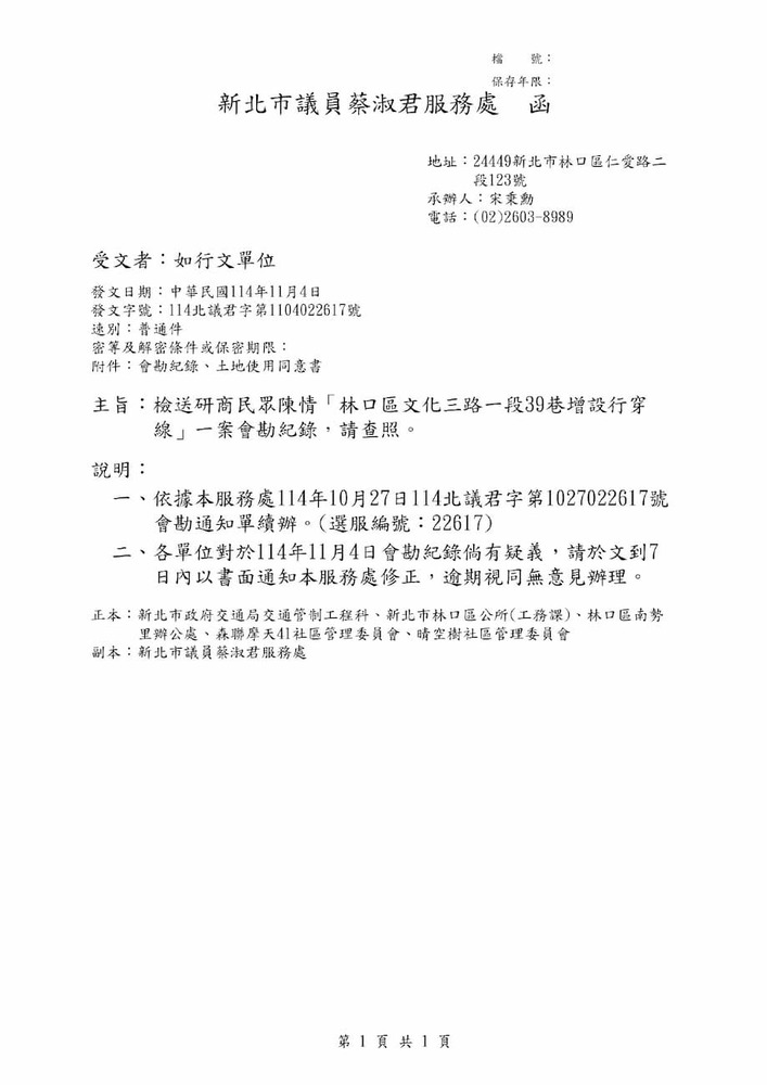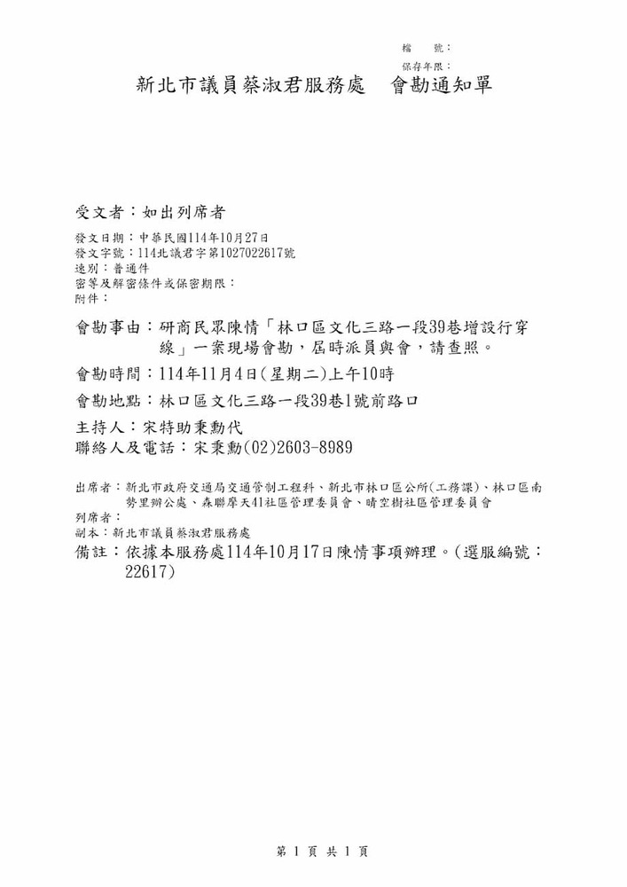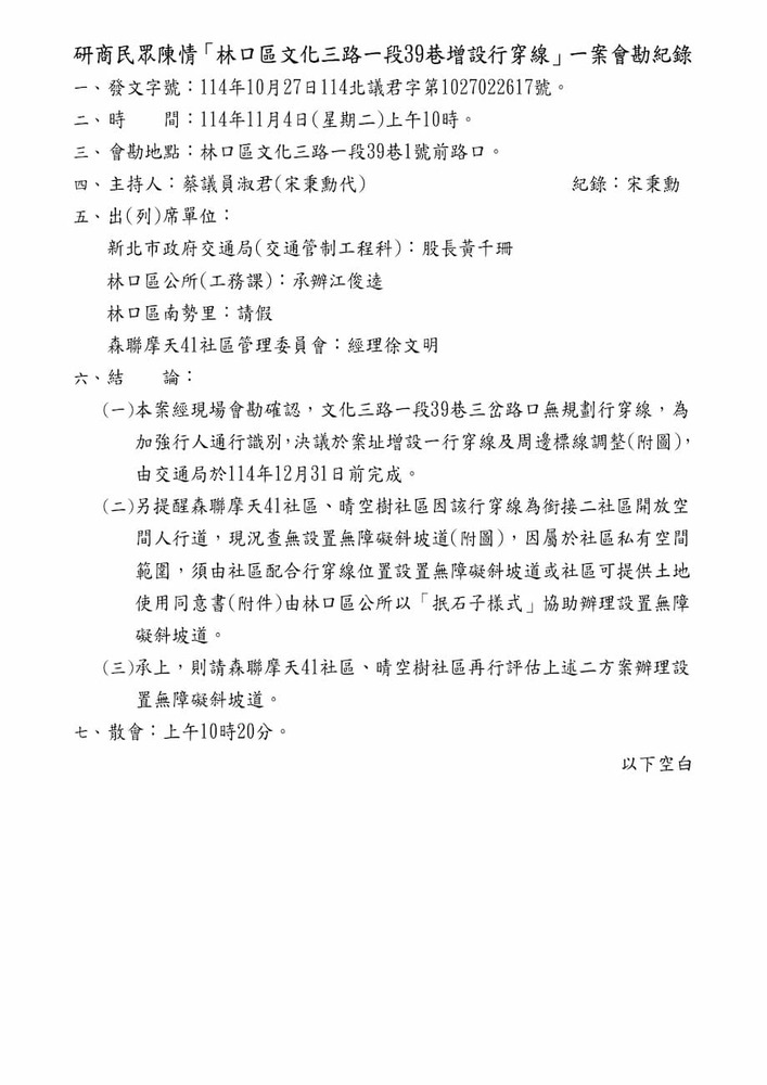 研商民眾陳情「林口區文化三路一段39巷增設行穿線」一案現場會勘。(22617)
