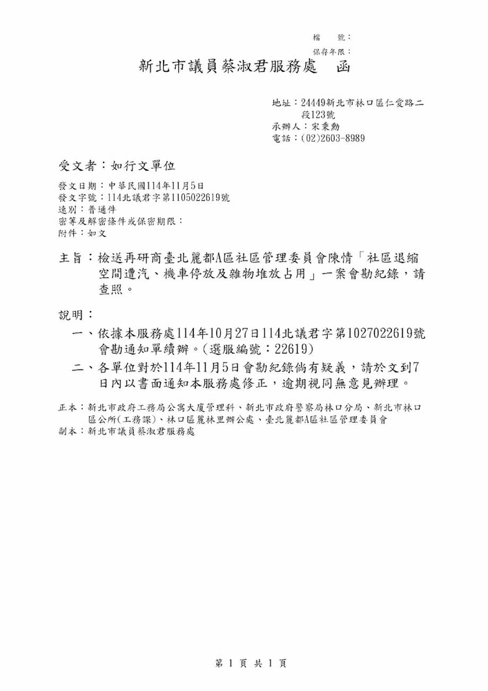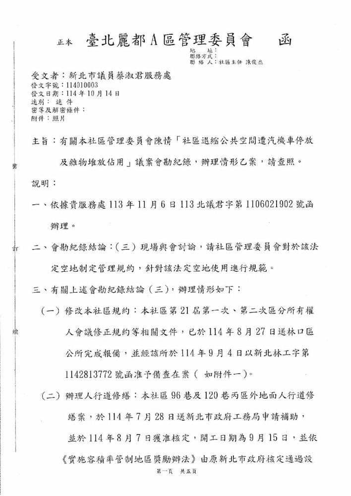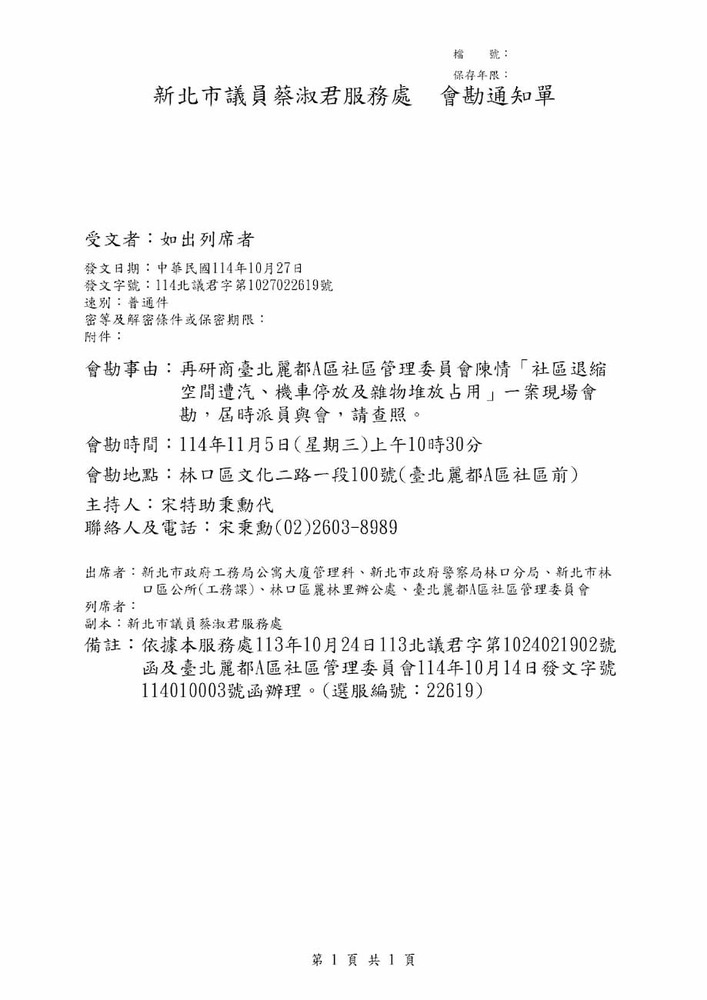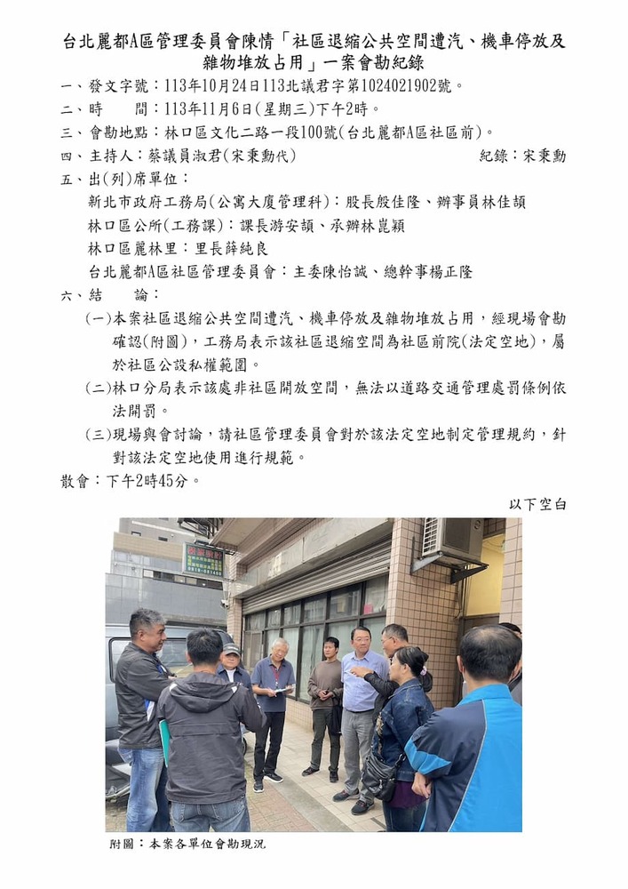 再研商臺北麗都A區社區管理委員會陳情「社區退縮空間遭汽、機車停放及雜物堆放占用」一案現場會勘。(22619)結案