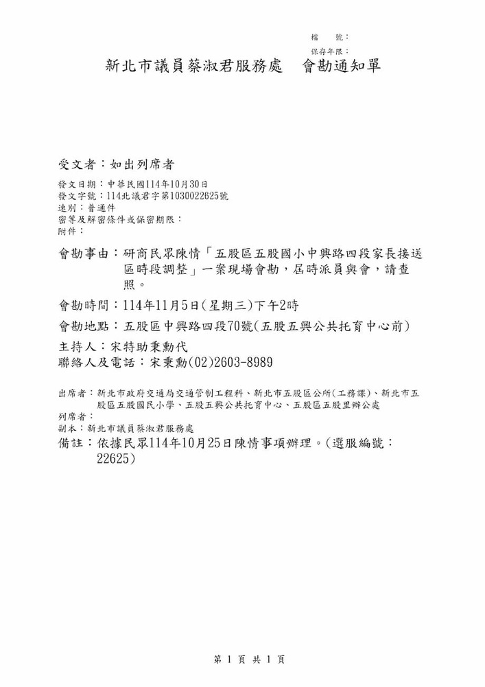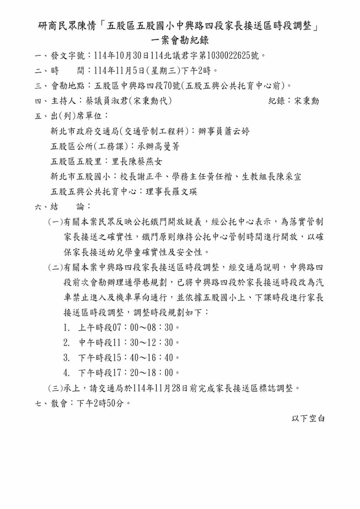 研商民眾陳情「五股區五股國小中興路四段家長接送區時段調整」一案現場會勘。(22625)