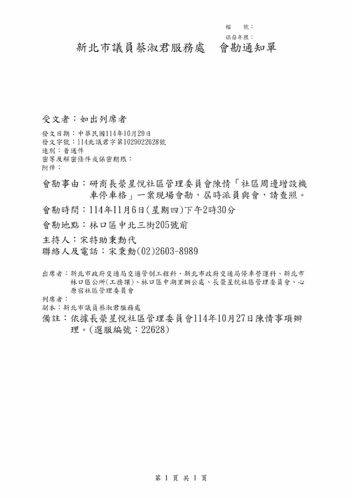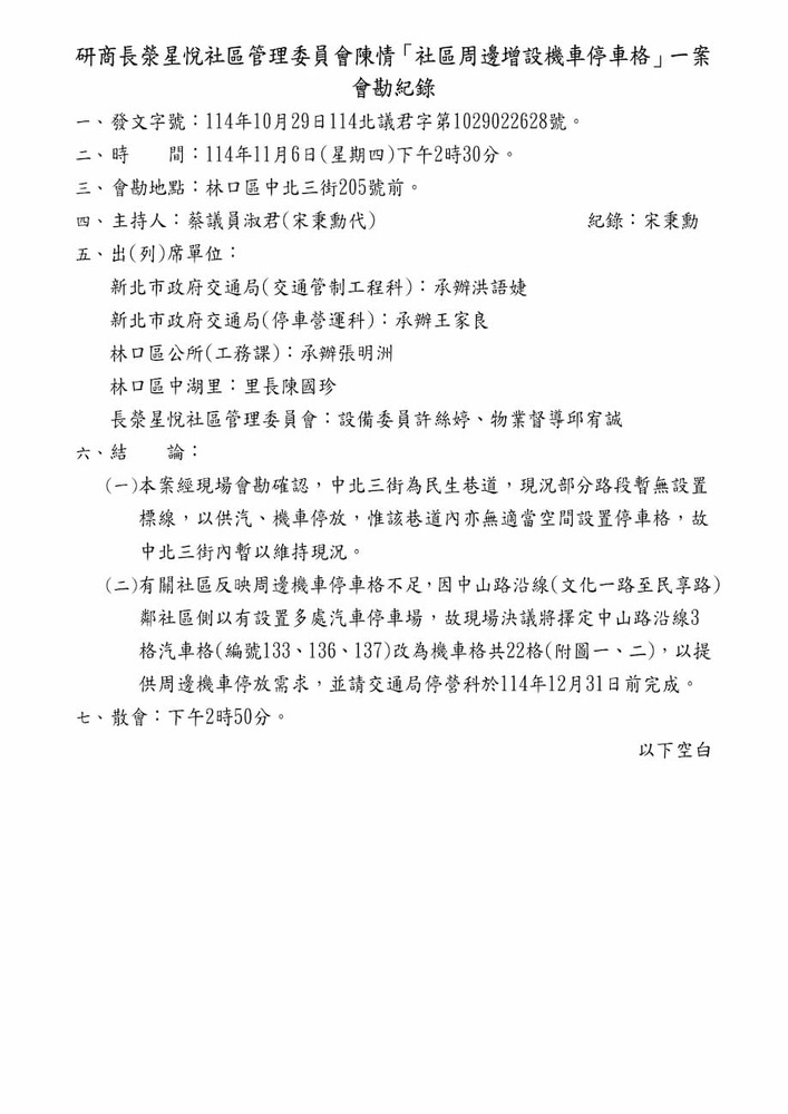 研商長滎星悅社區管理委員會陳情「社區周邊增設機車停車格」一案現場會勘。(22628)
