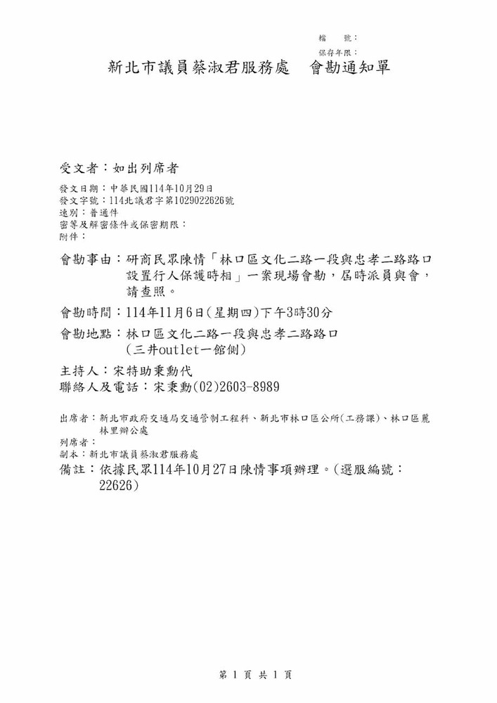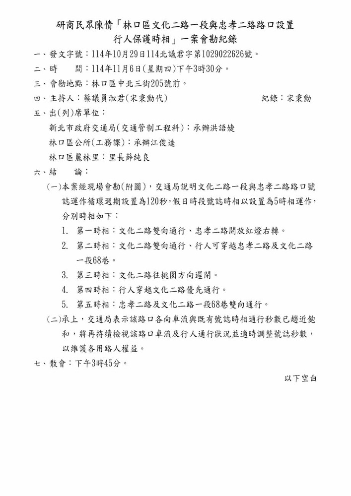 研商民眾陳情「林口區文化二路一段與忠孝二路路口設置行人保護時相」一案現場會勘。(22626)結案