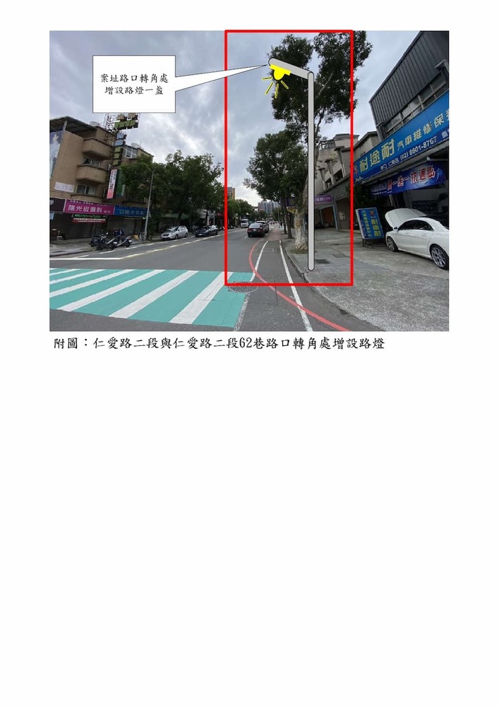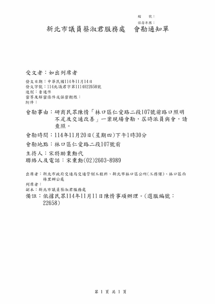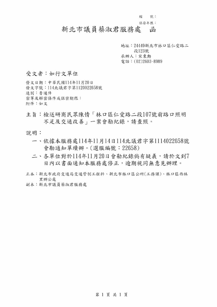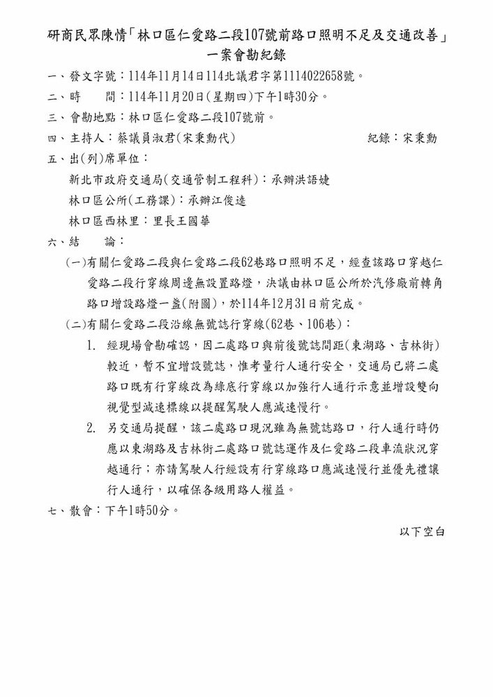 研商民眾陳情「林口區仁愛路二段107號前路口照明不足及交通改善」一案現場會勘。(22658)