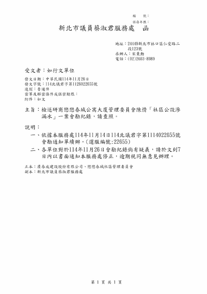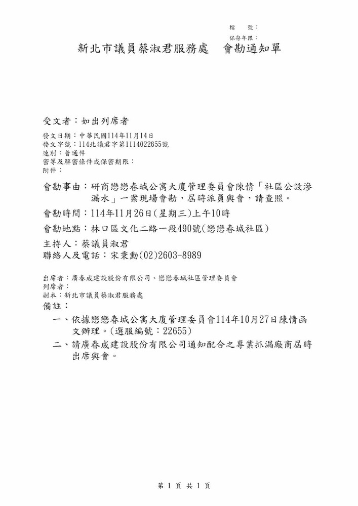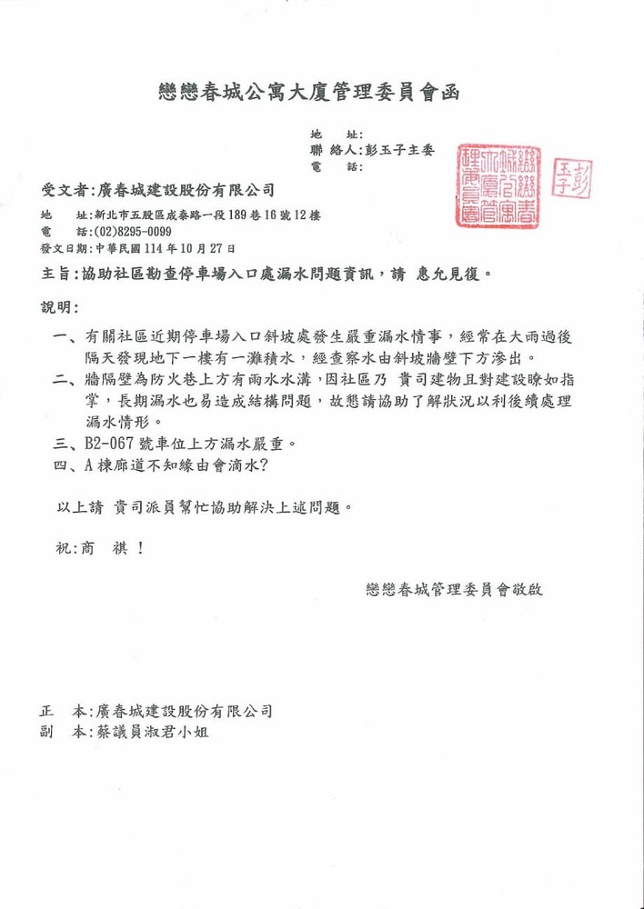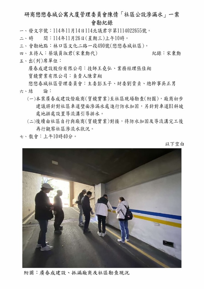 研商戀戀春城公寓大廈管理委員會陳情「社區公設滲漏水」一案現場會勘。(22655)結案