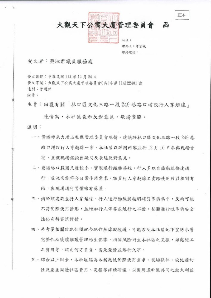 研商力璞玉社區管理委員會陳情「林口區文化三路一段249巷路口增設行穿線」一案現場會勘。(22697)