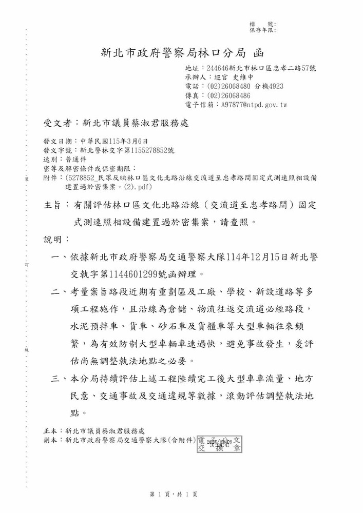 有關民眾反映林口區文化北路沿線交流道至忠孝路間固定式測速照相設備建置過於密集案。(22716)結案