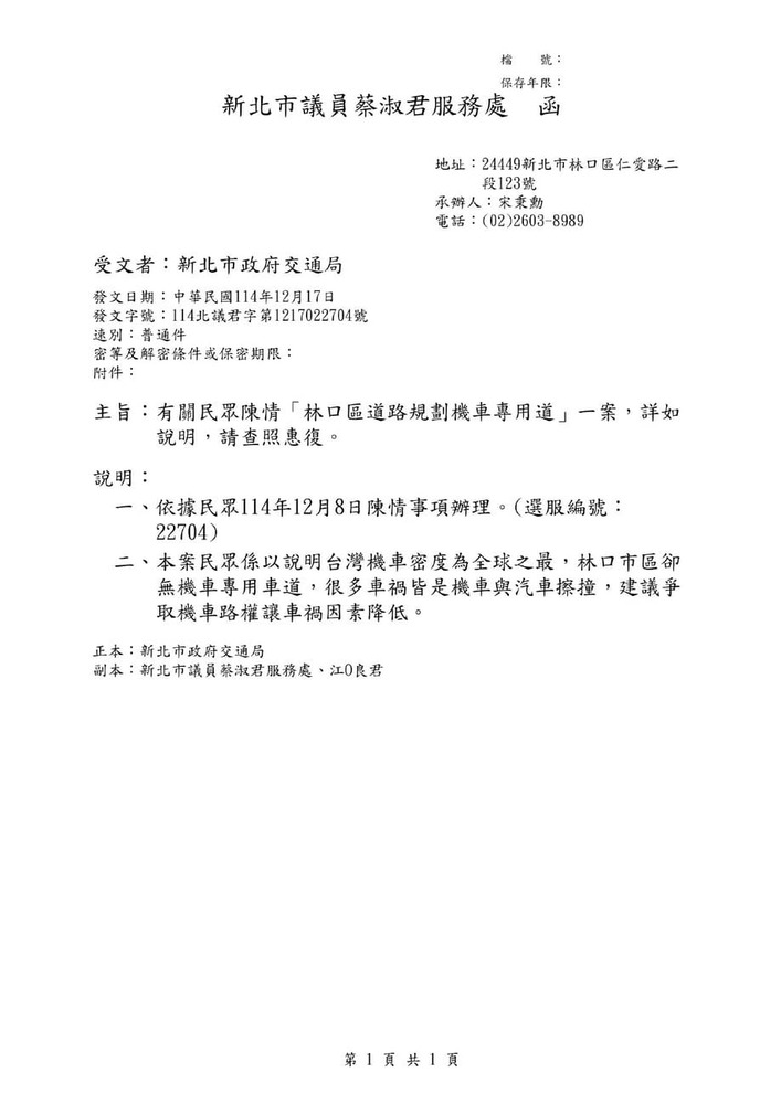 有關民眾陳情「林口區道路規劃機車專用道」一案,詳如說明,請查照惠復。(22704)