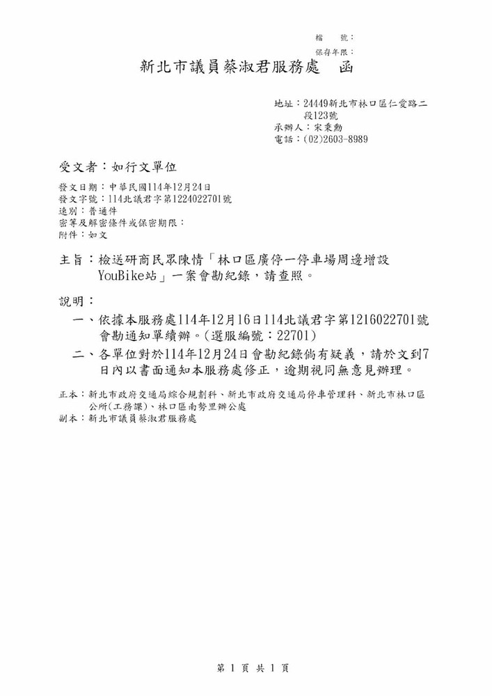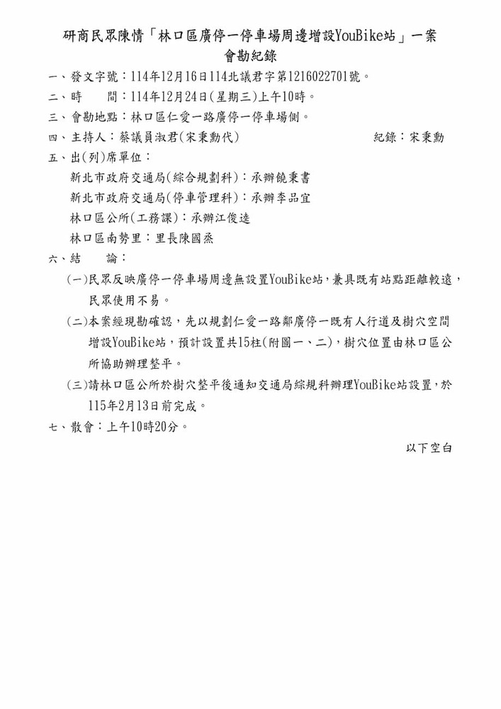 研商民眾陳情「林口區廣停一停車場周邊增設YouBike站」一案現場會勘。(22701)