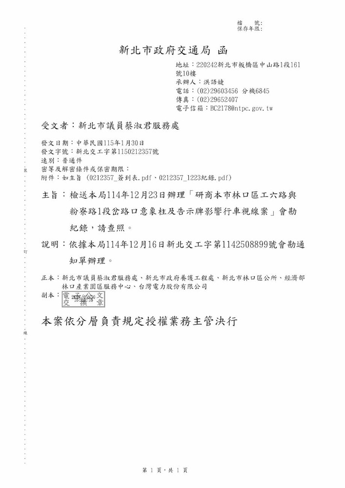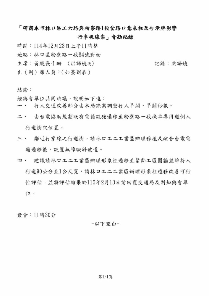 研商本市林口區工六路與粉寮路1段岔路口意象柱及告示牌影響行車視線案。(22738)