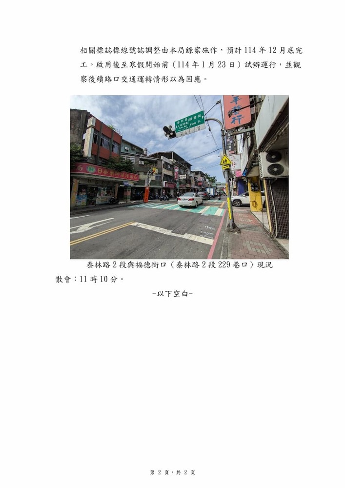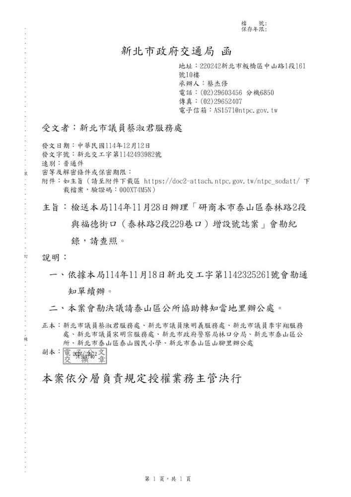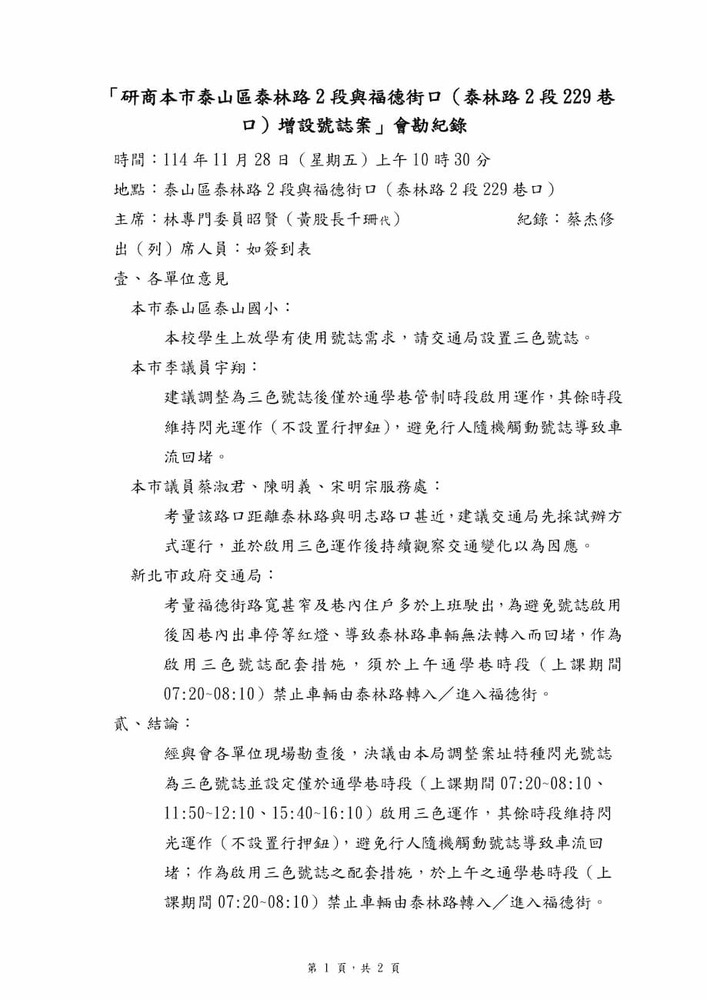 檢送本局114年11月28日辦理「研商本市泰山區泰林路2段與福德街口(泰林路2段229巷口)稱設號誌案」會勘紀錄。(22727)