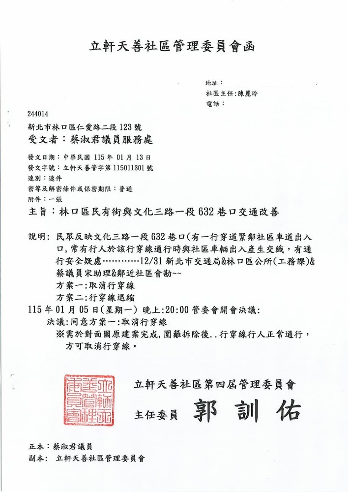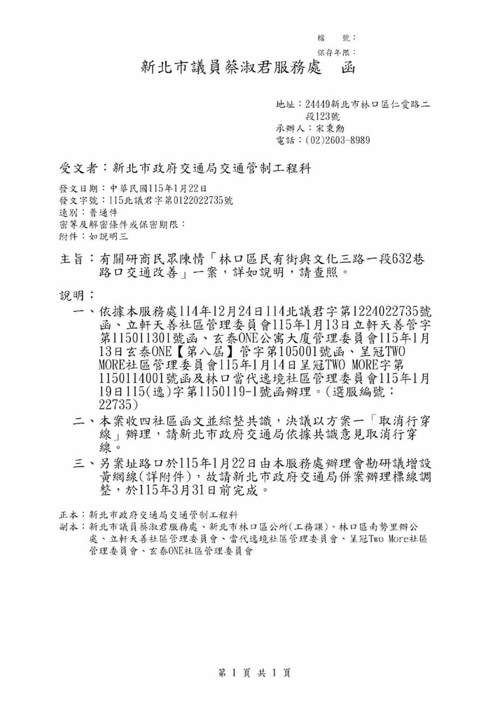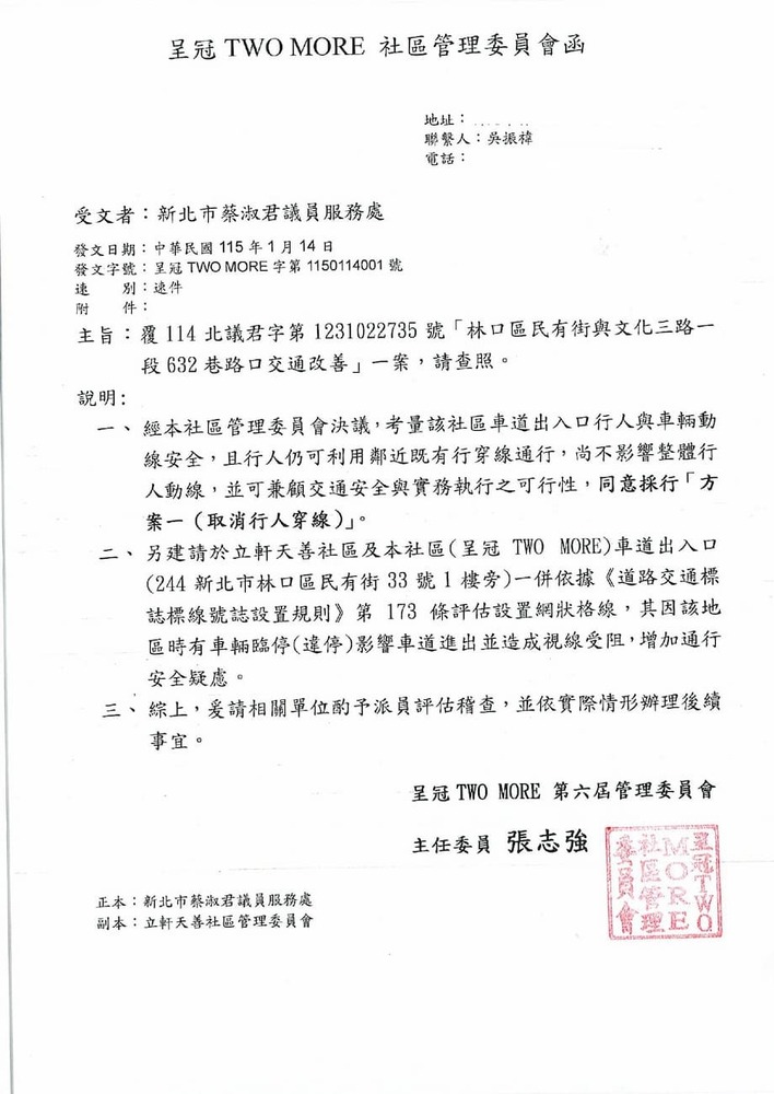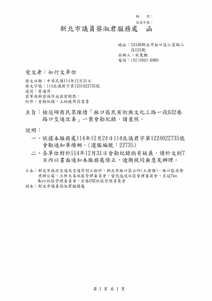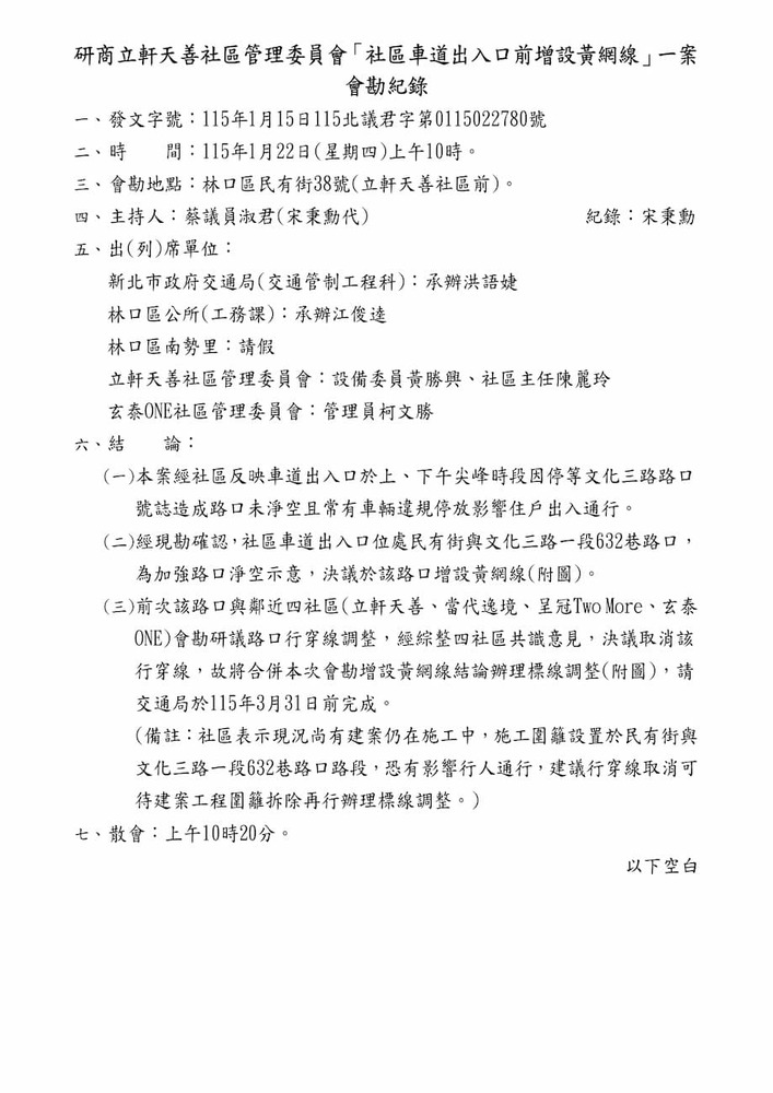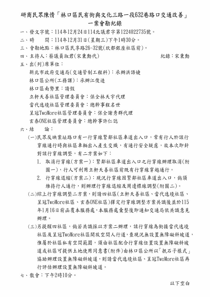研商民眾陳情「林口區民有街與文化三路一段632巷路口交通改善」一案現場會勘。(22735)