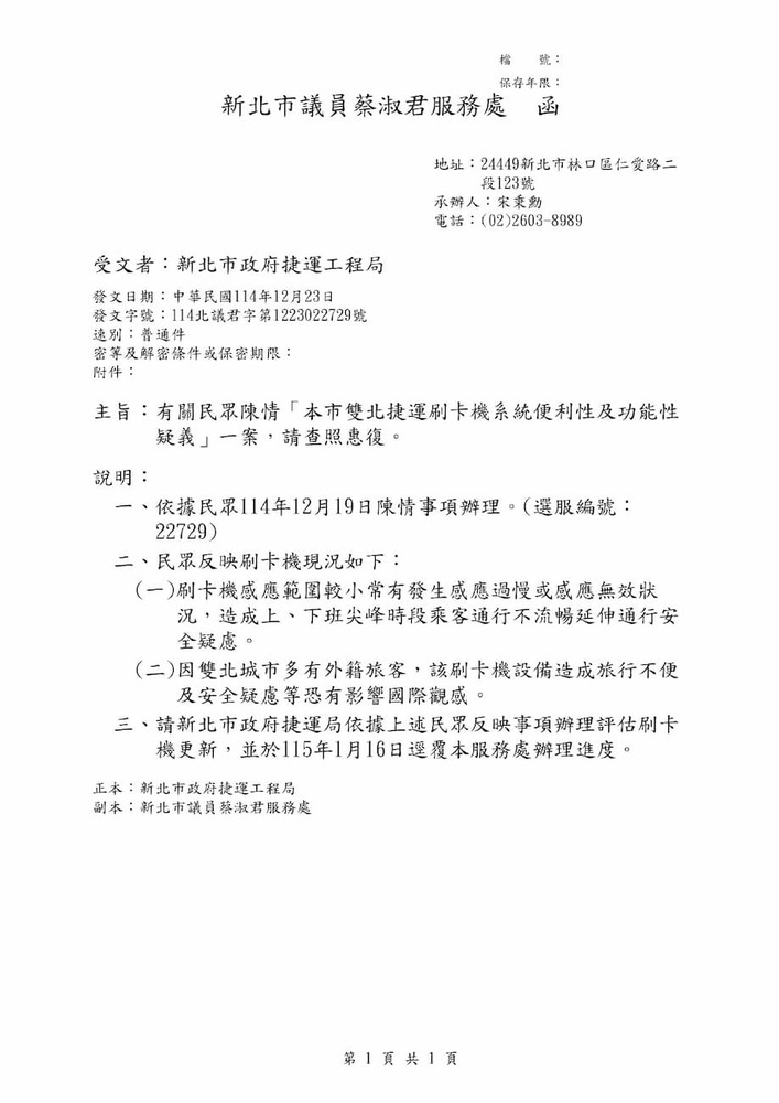 有關民眾陳情「本市雙北捷運刷卡機系統便利性及功能性疑義」一案,請查照惠復。(22729)結案