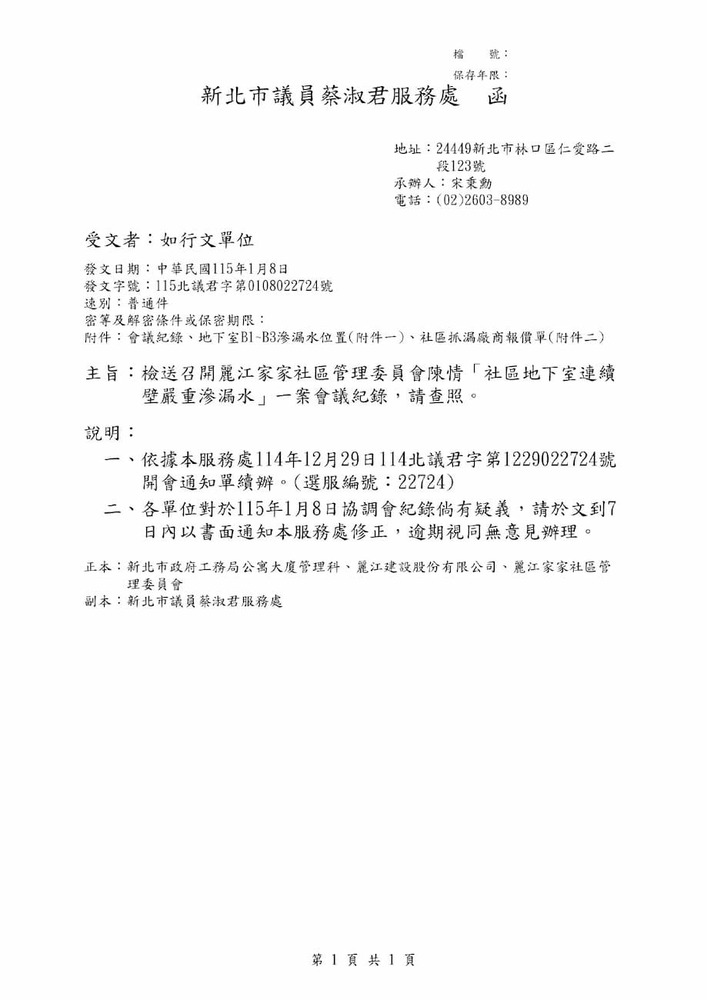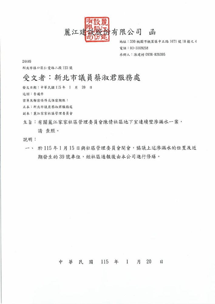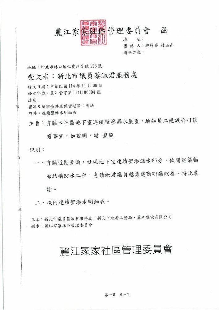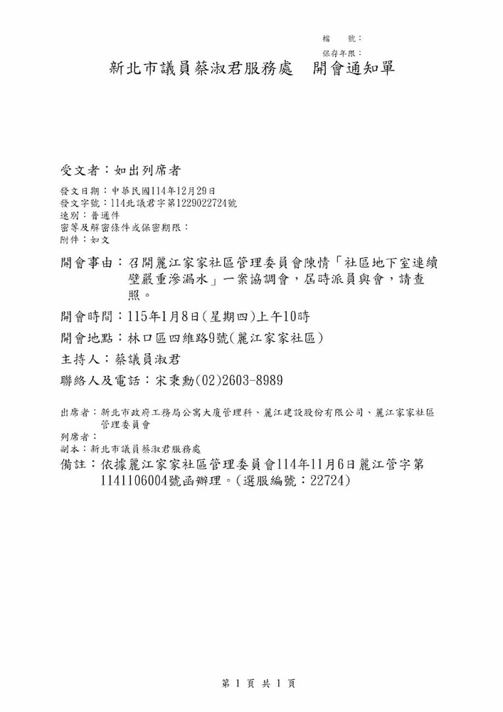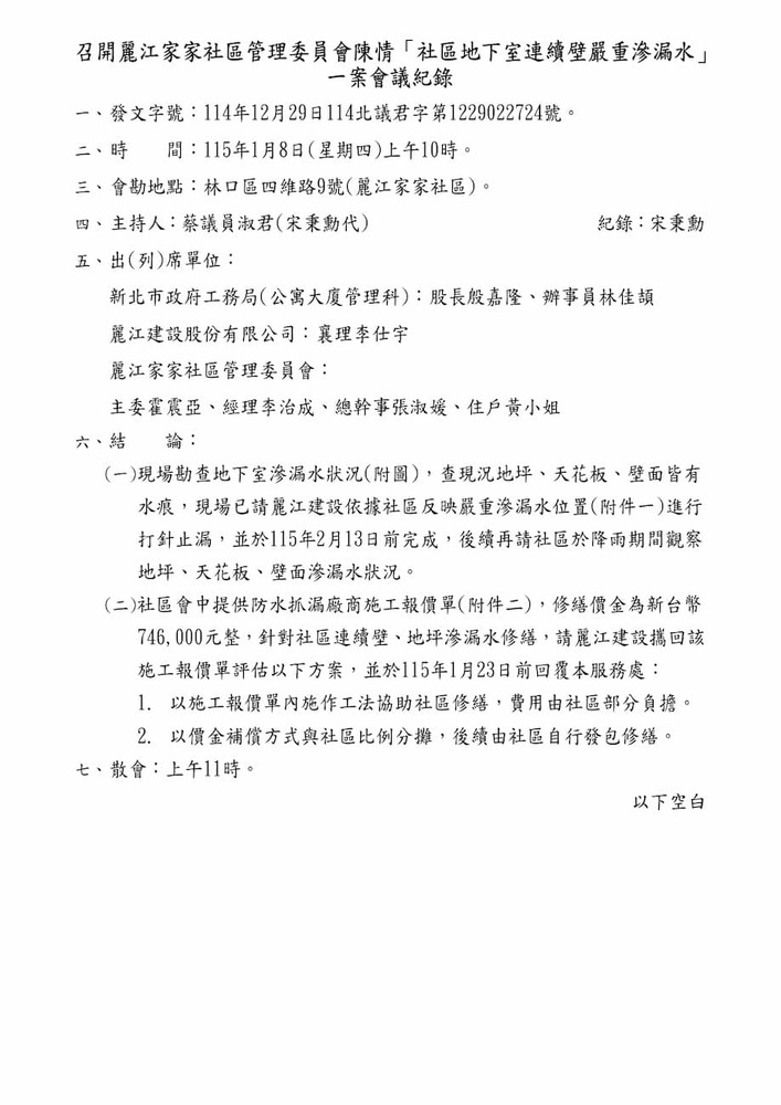 召開麗江家家社區管理委員會陳情「社區地下室連續壁嚴重滲漏水」一案協調會。(22724)