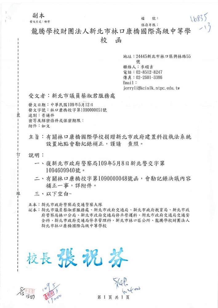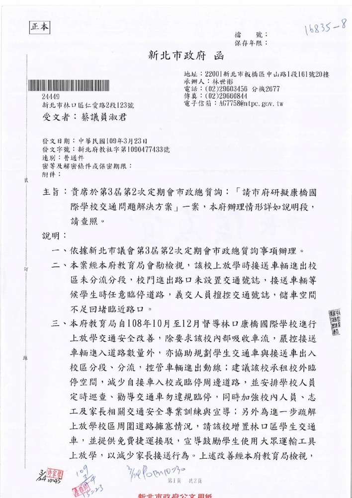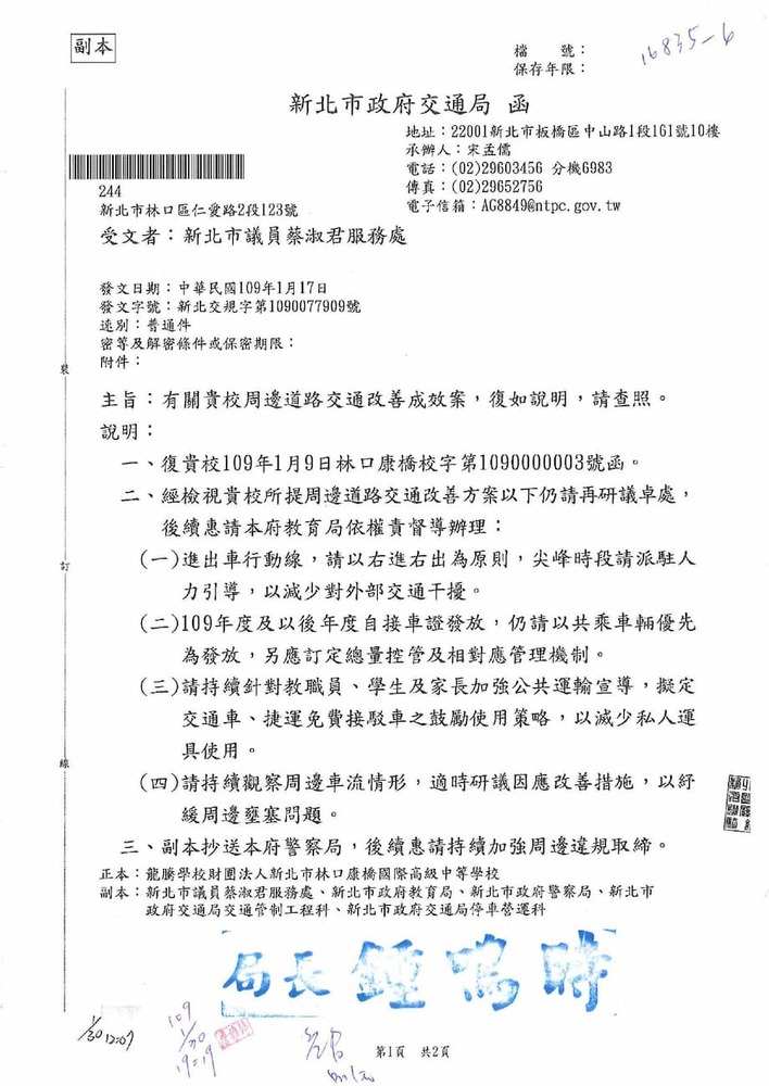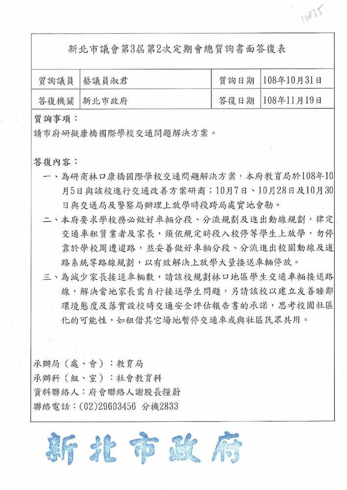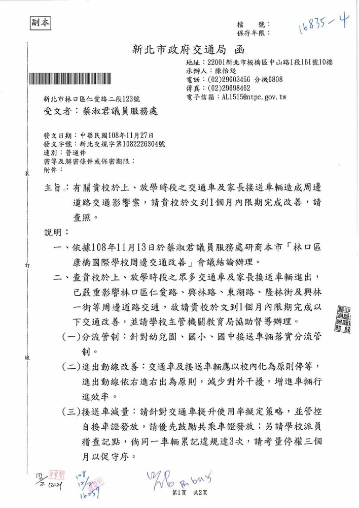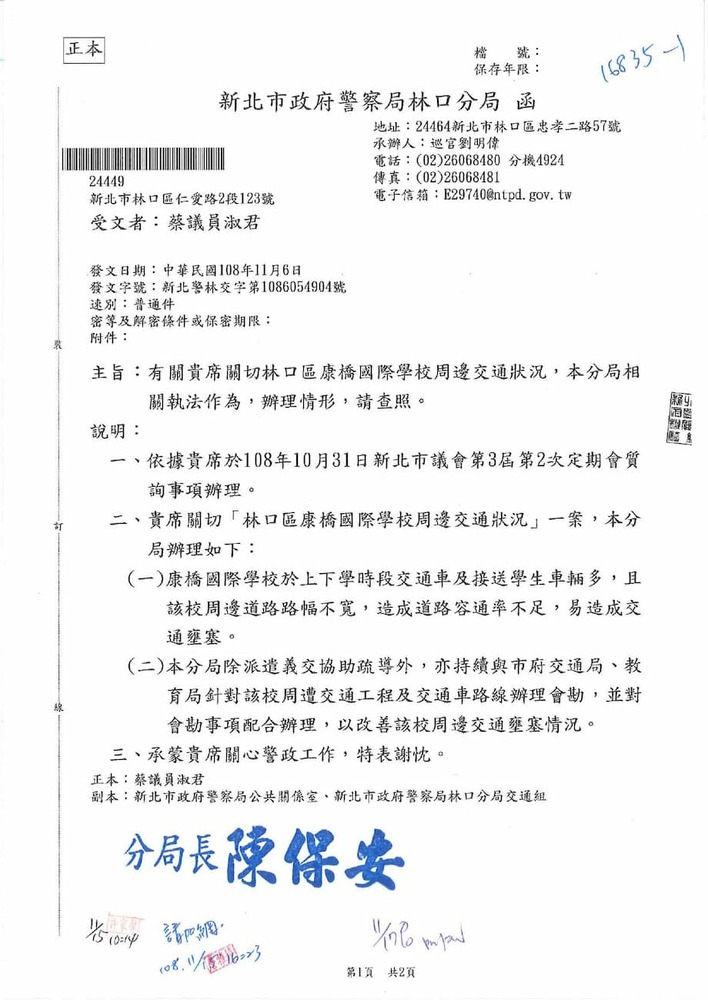 有關貴席關切林口區康橋國際學校週邊交通狀況,本分局相關執法作為,辦理情形。(16835)結案