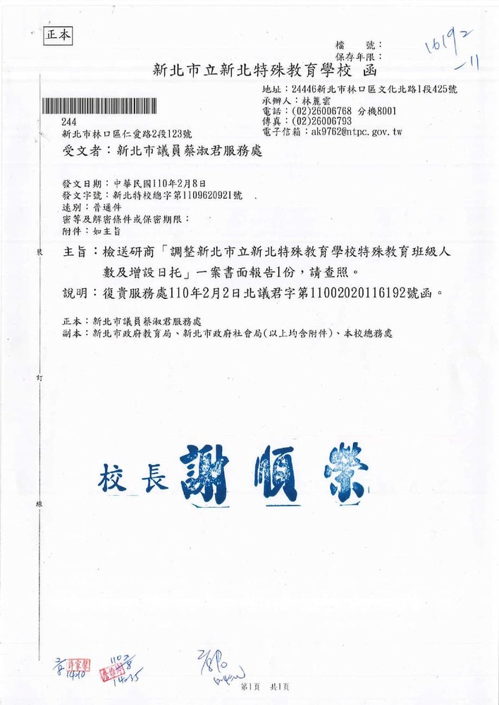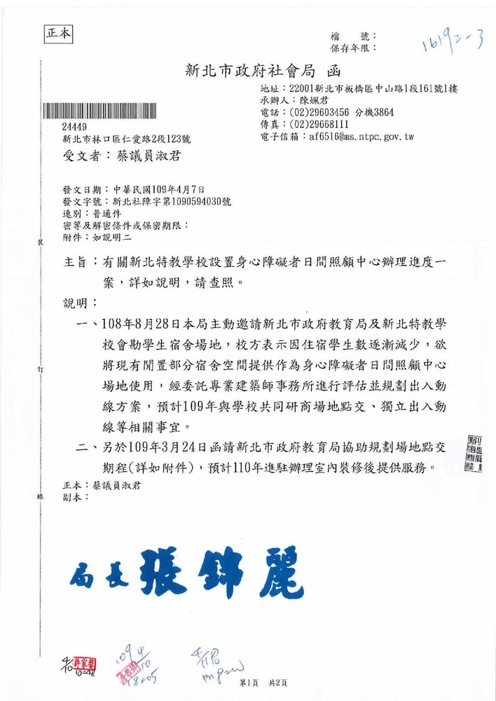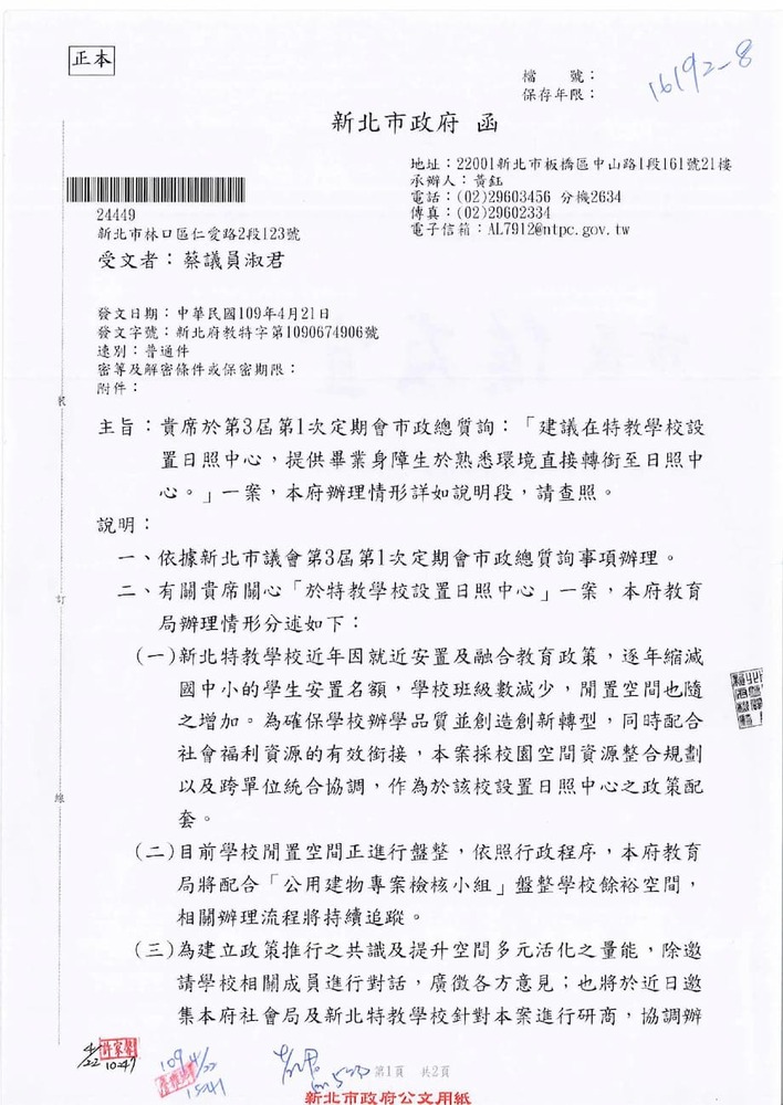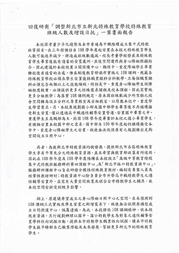 有關新北特教學校設置身心障礙者日間照顧中心辦理進度一案。(16192)結案