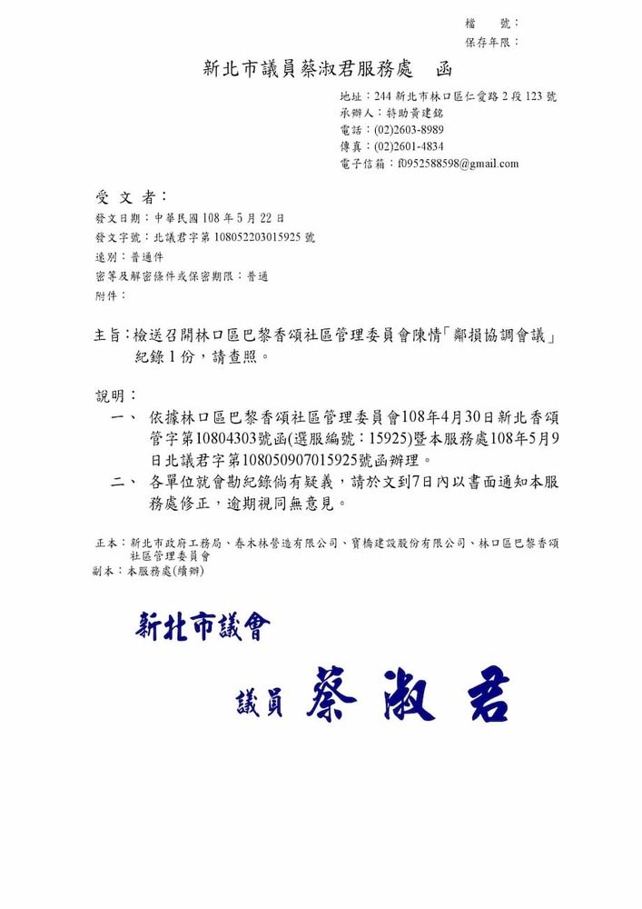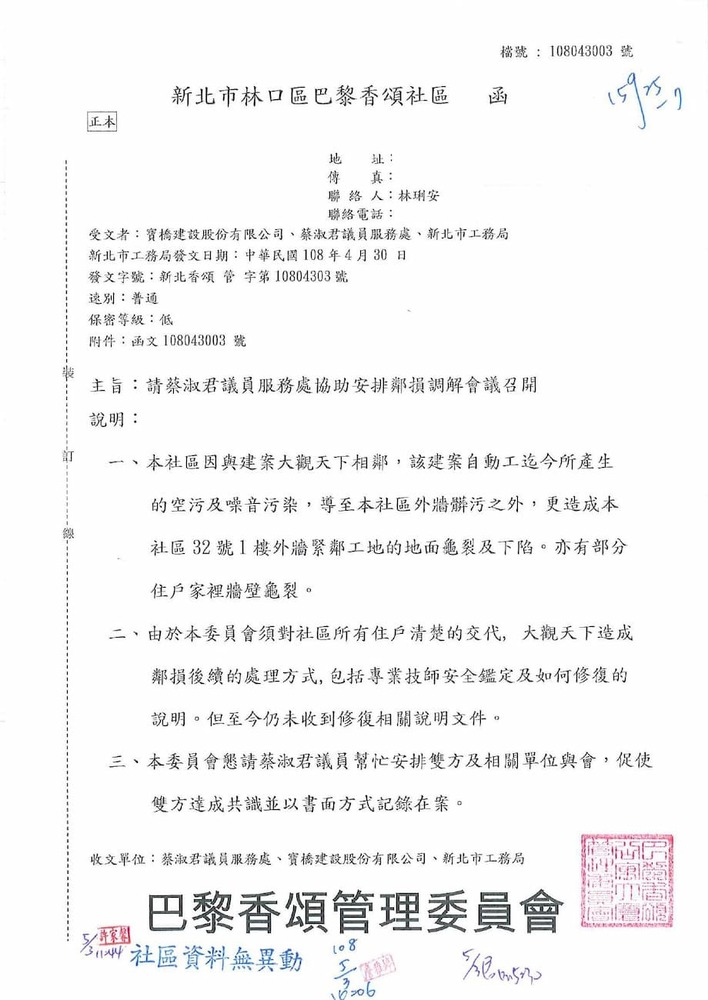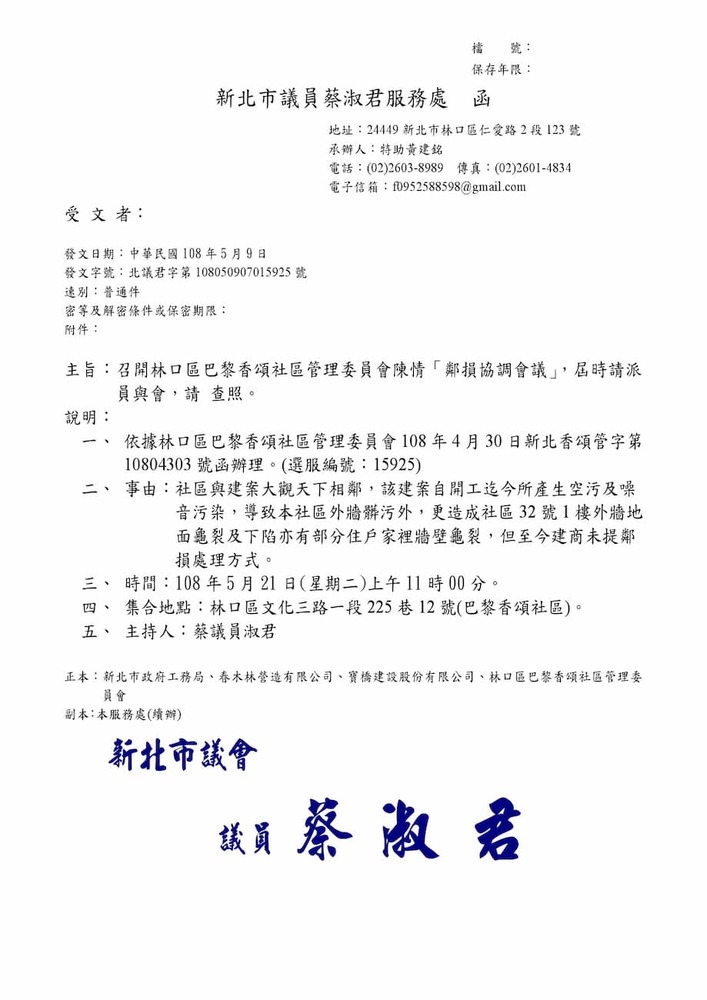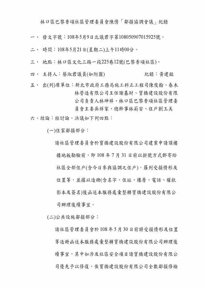 研商林口區巴黎香頌社區管理委員會陳情「鄰損協調會議」。(15925)結案