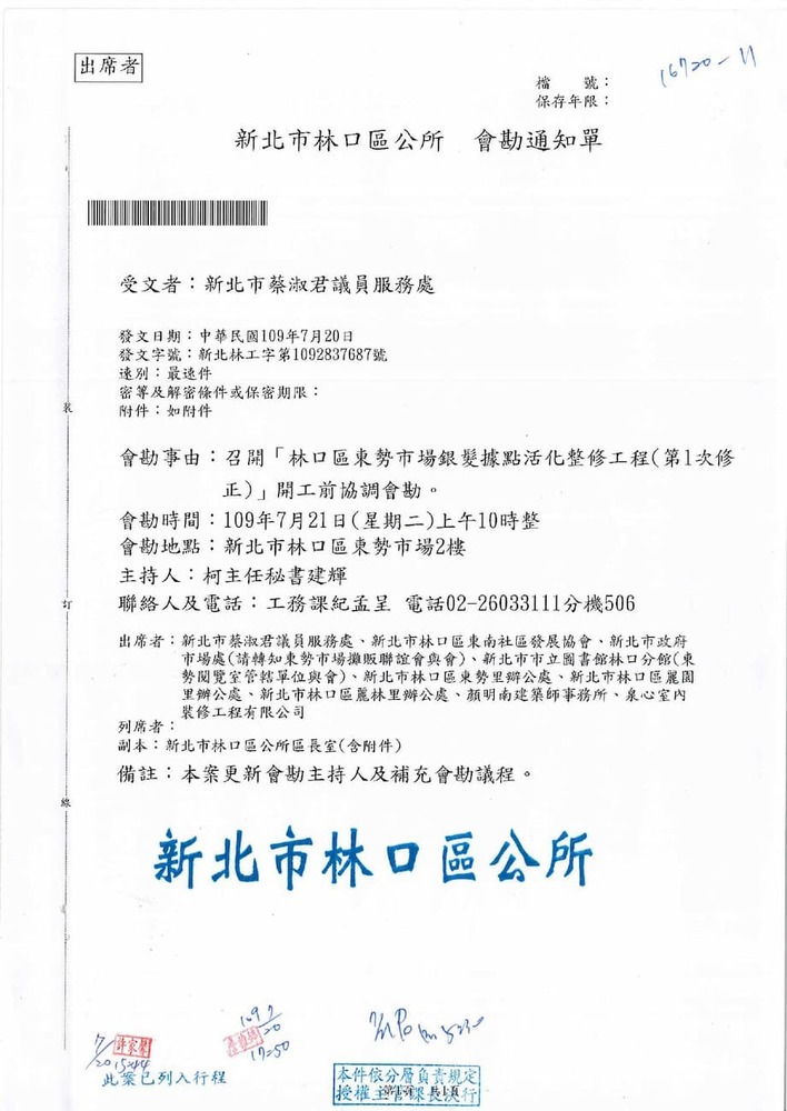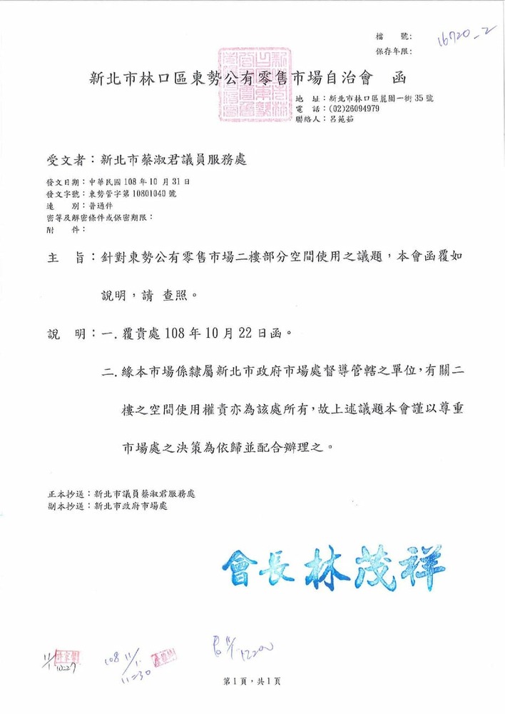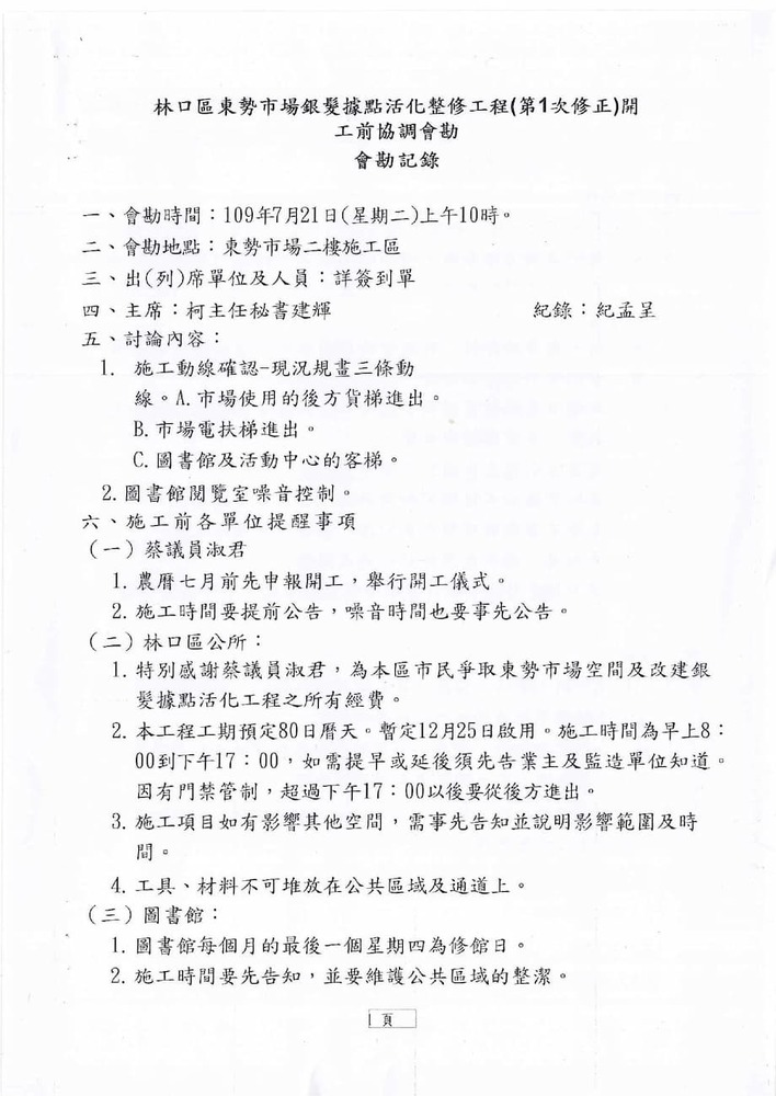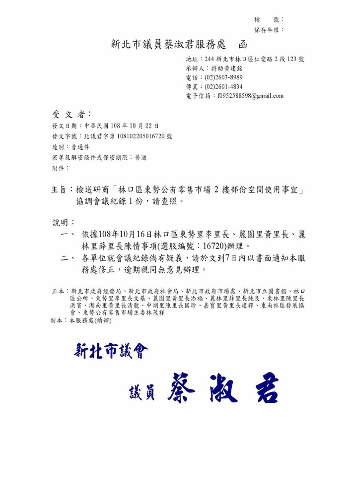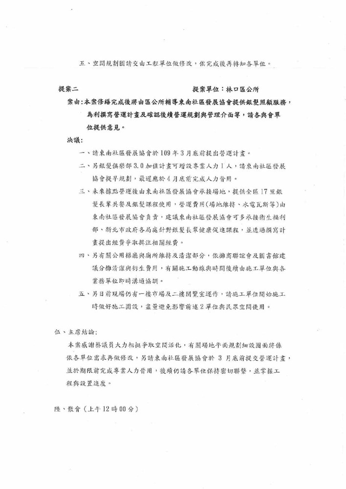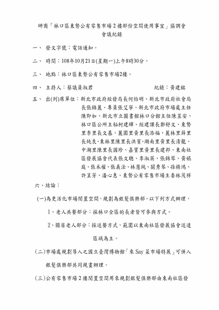 研商「林口區東勢公有零售市場2樓部份空間使用事宜」協調會議紀錄。(16720)結案