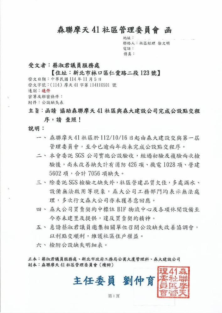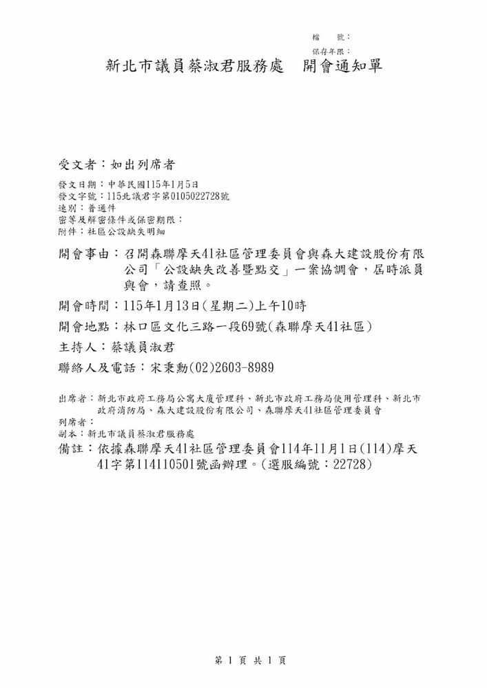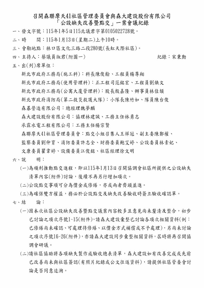 召開森聯摩天41社區管理委員會與森大建設股份有限公司「公設缺失改善暨點交」一案協調會。(22728)