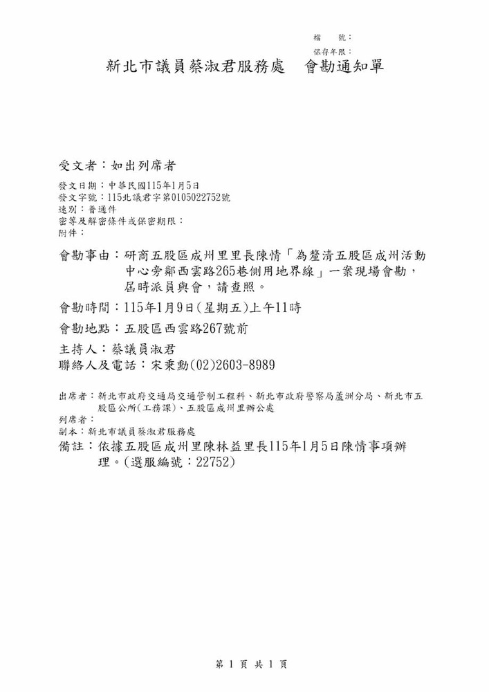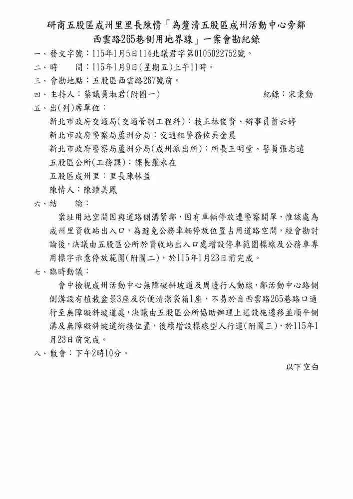 研商五股區成洲里里長陳情「為釐清五股區成洲活動中心旁鄰西雲路265巷側用地界線」一案現場會勘。(22752)