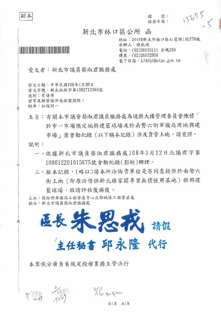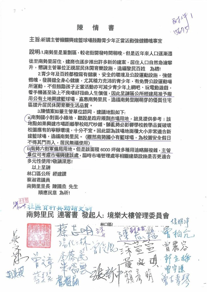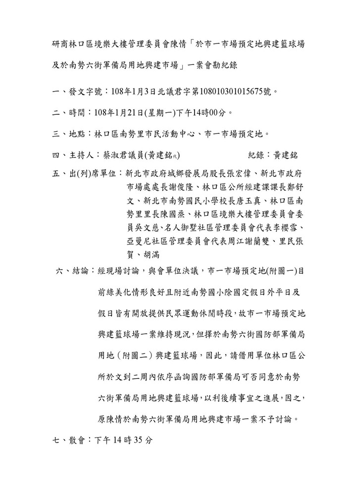 研商林口區境樂大樓管理委員會陳情「於市一市場預定地興建籃球場及於南勢六街軍備局用地興建市場」一案會勘。(15675)結案